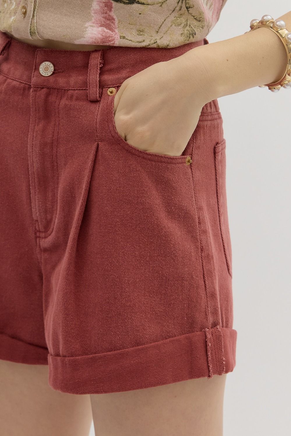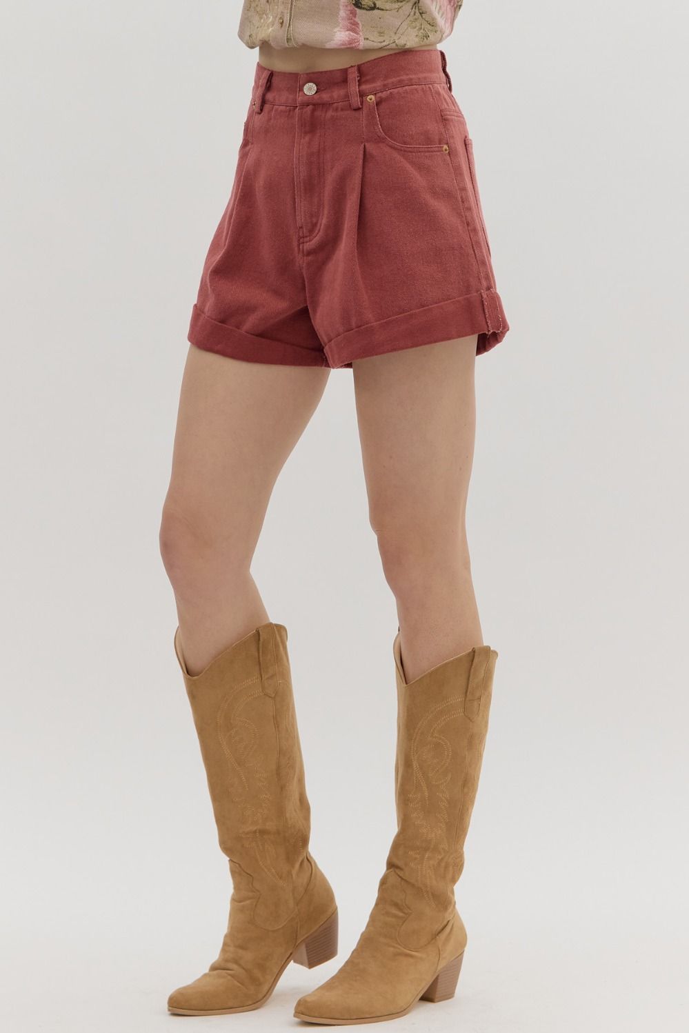 • Solid high-waist roll-up hem shorts featuring pleated detail at front