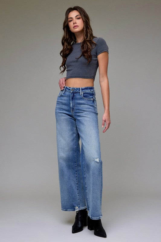 • Medium wash clean stretch high rise wide leg jean