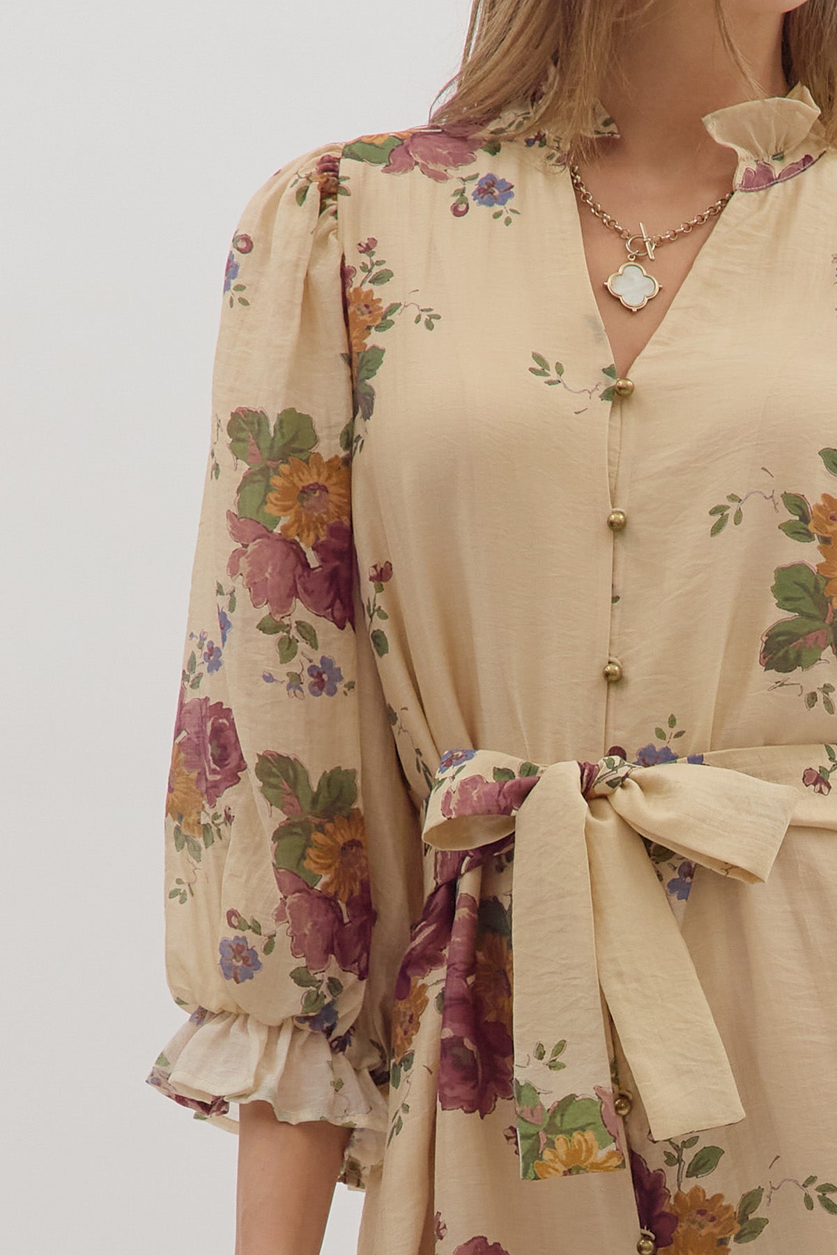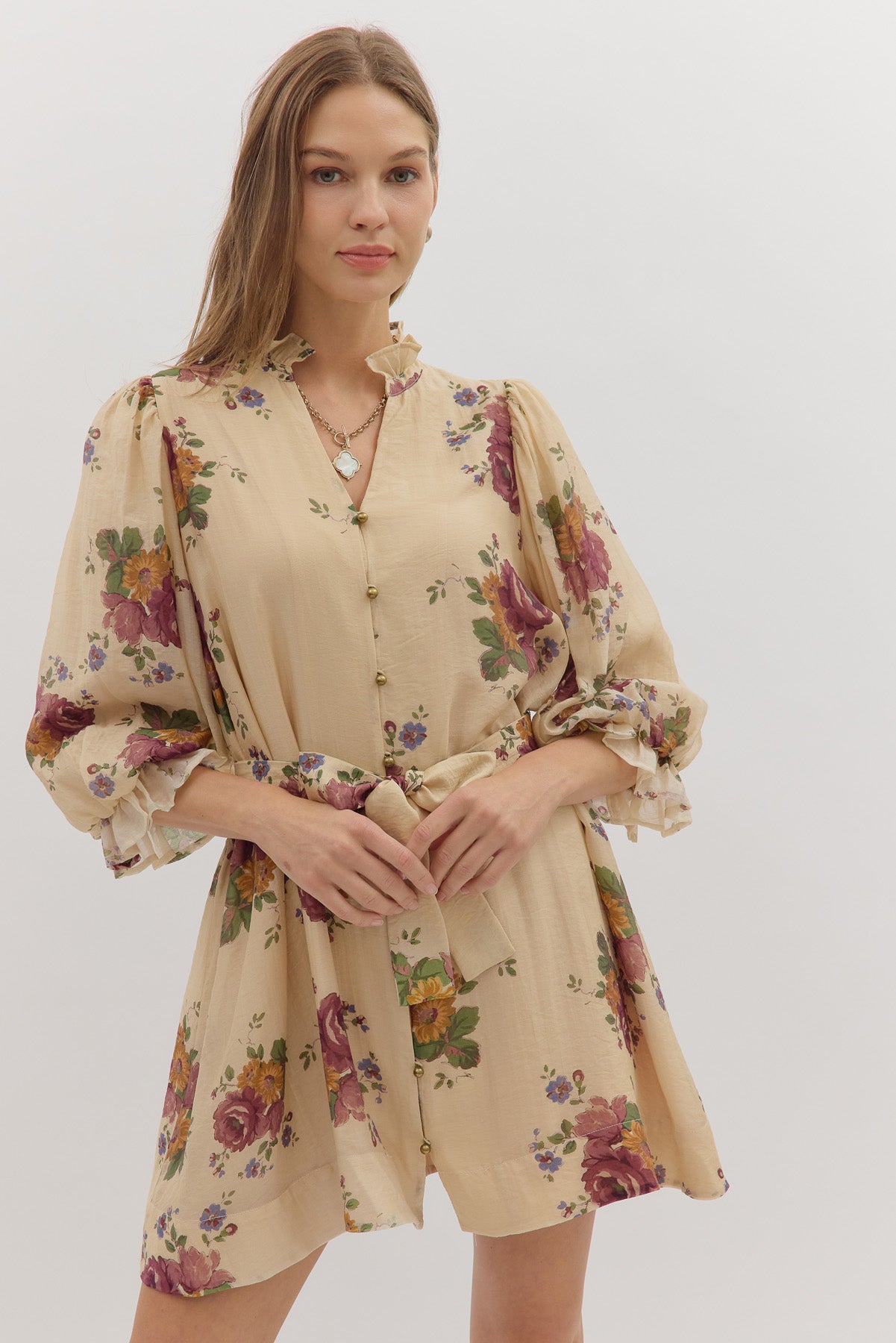 • Floral print puff 3/4 sleeve mini dress featuring ruffled accent neck band collar V-neck