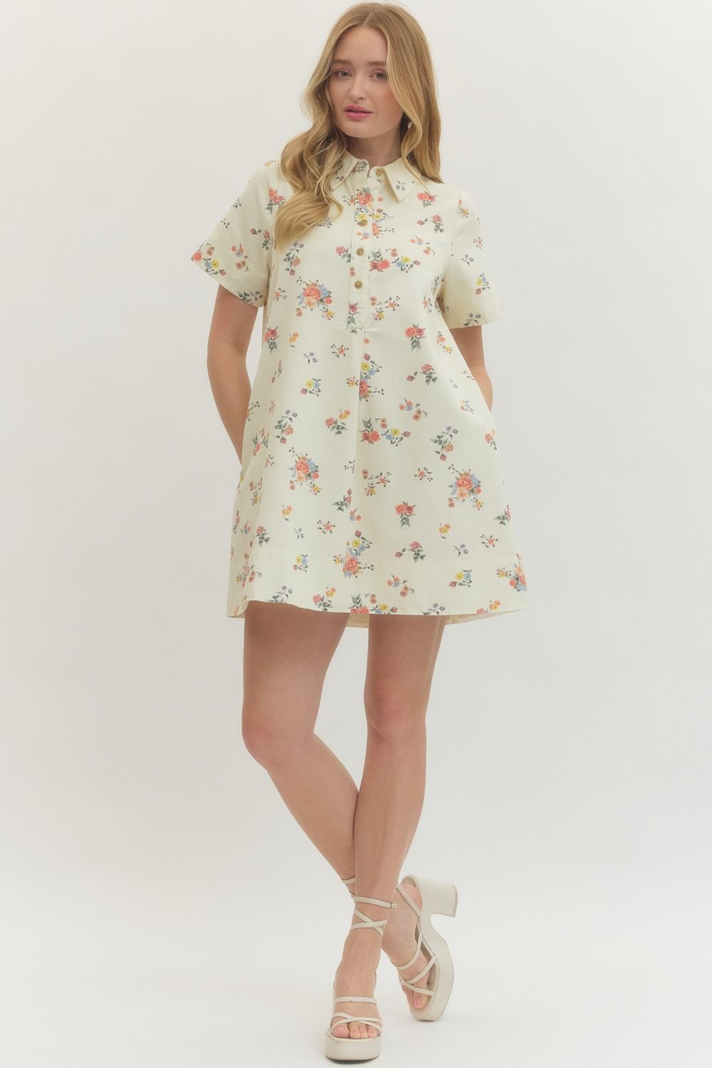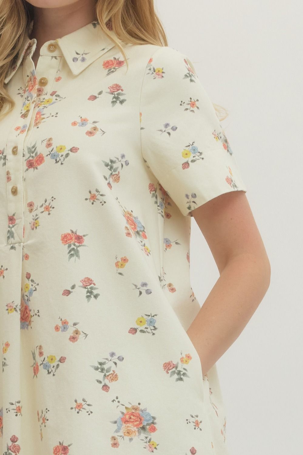 • Floral short sleeve mini dress featuring button closure at front and point collar