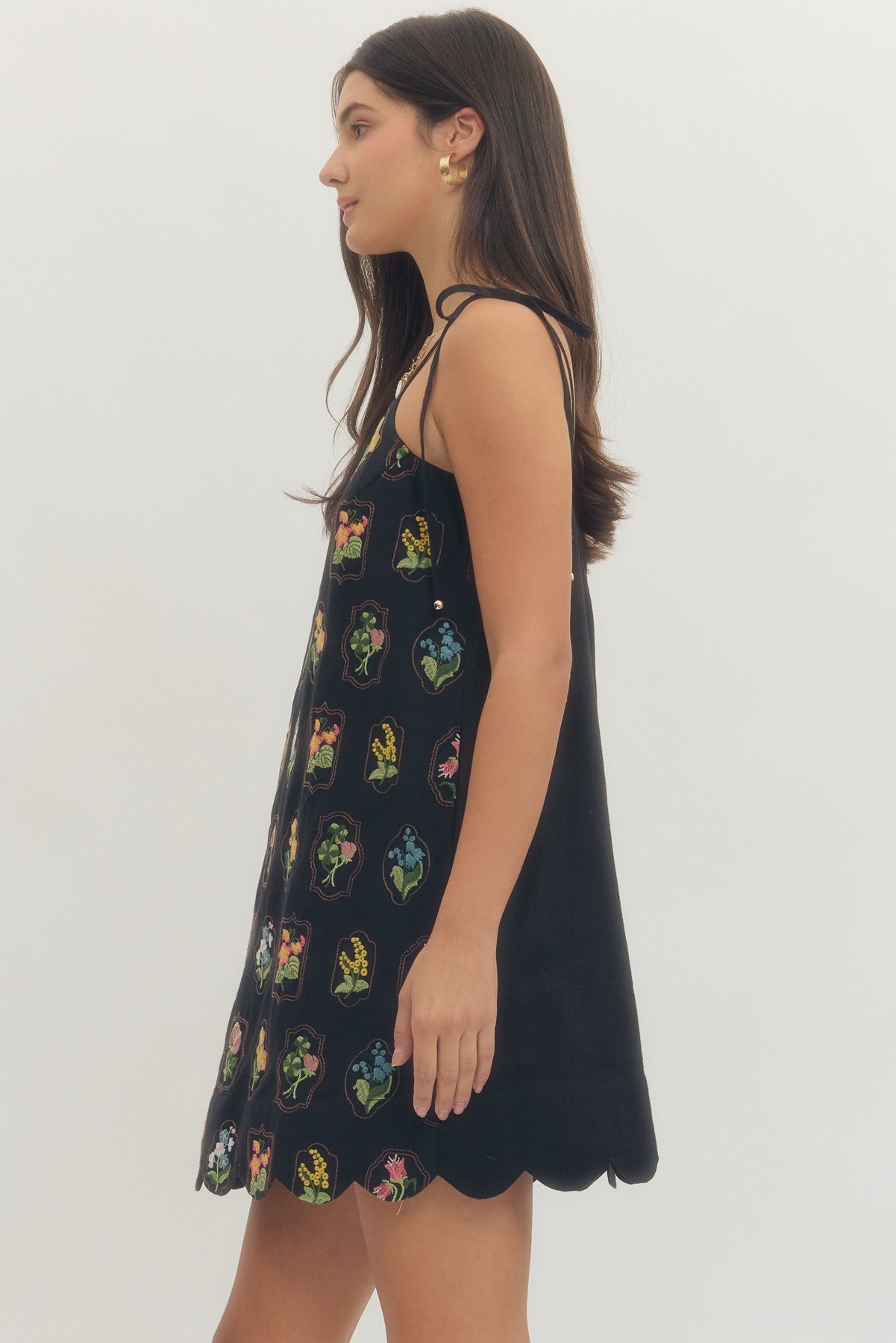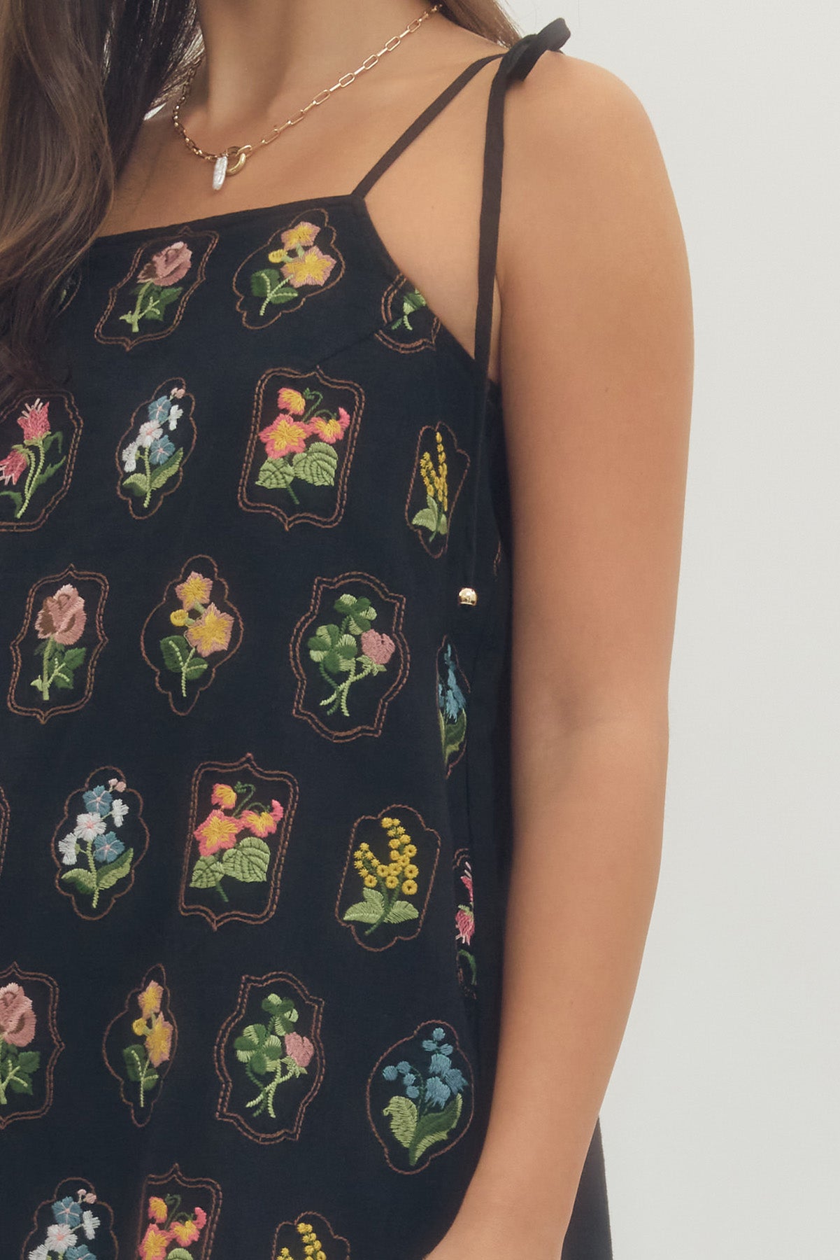 • Floral embroidered sleeveless mini dress featuring tie shoulder straps
