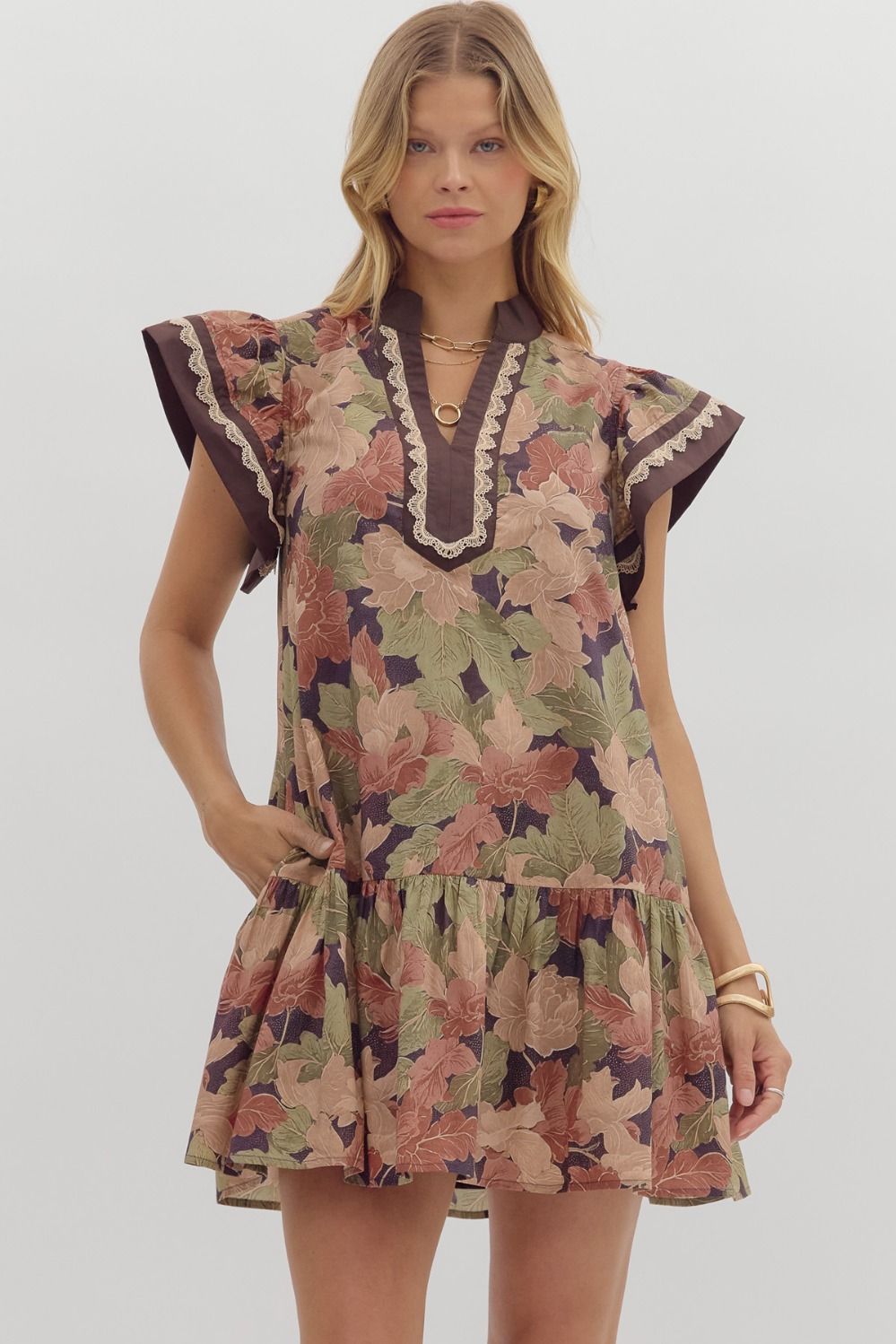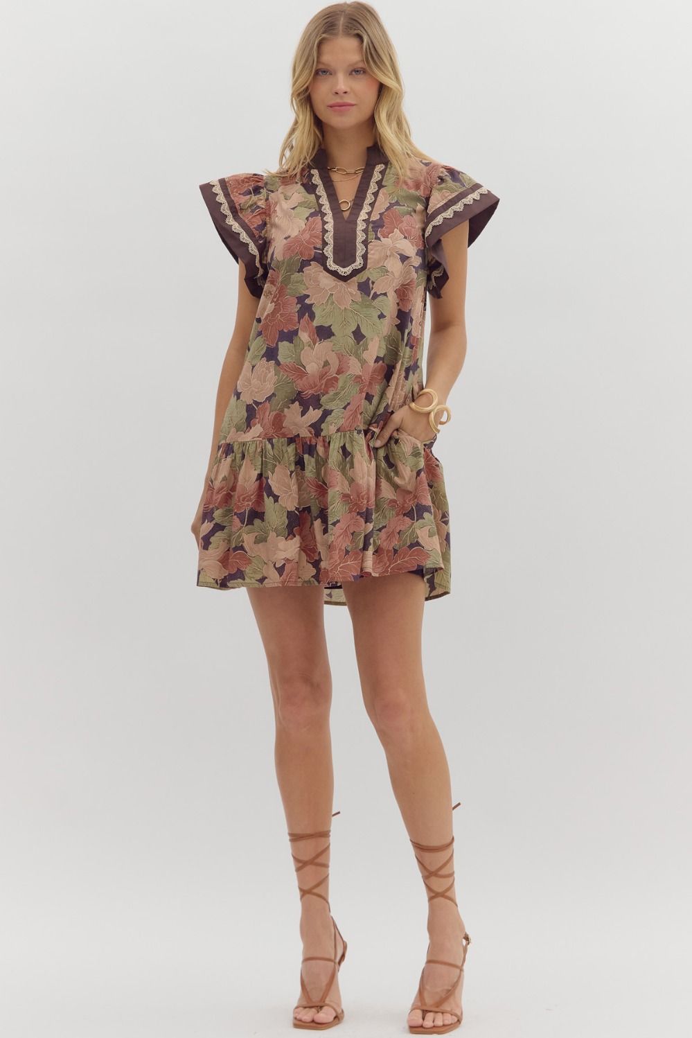 • Floral print flutter sleeve mini dress