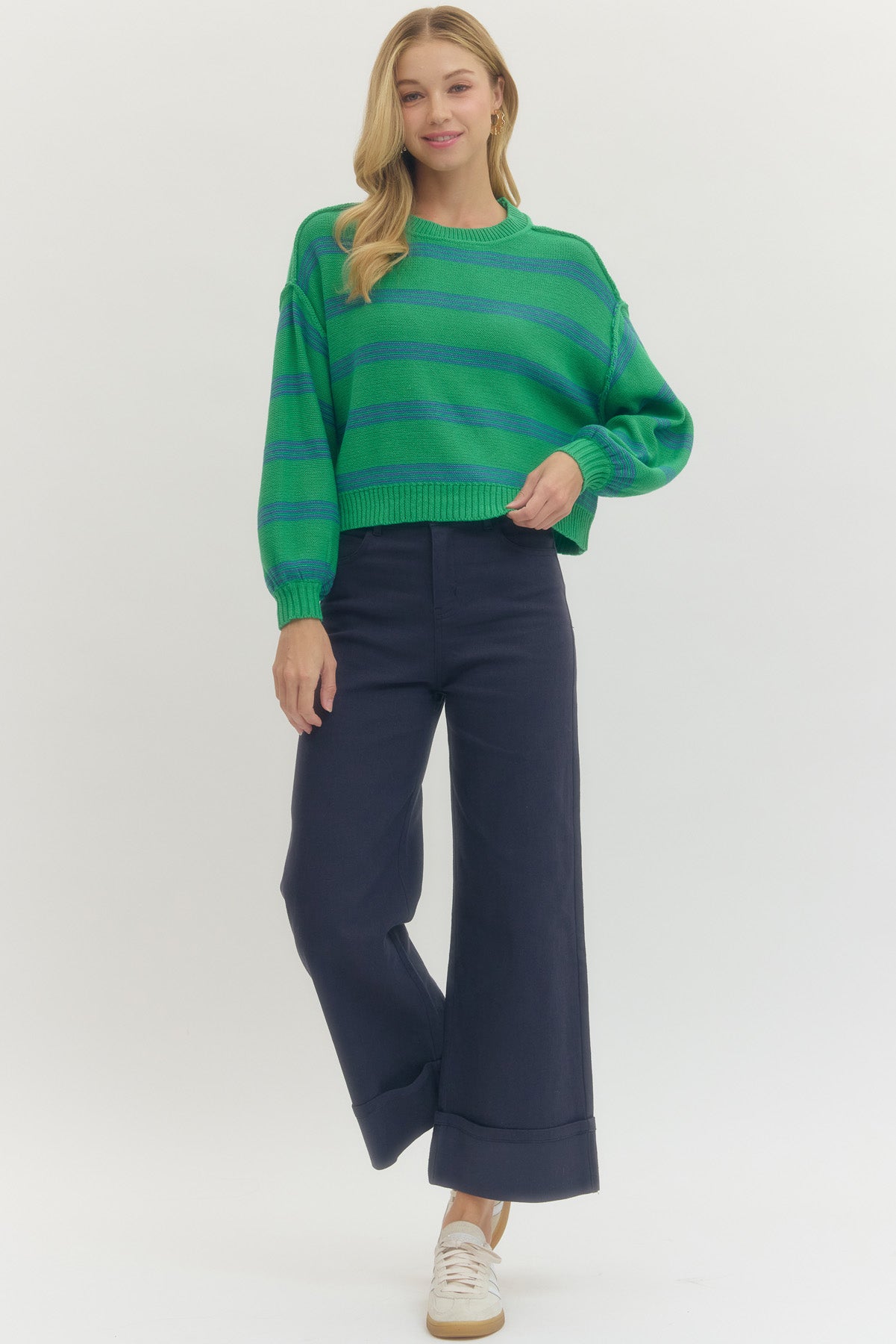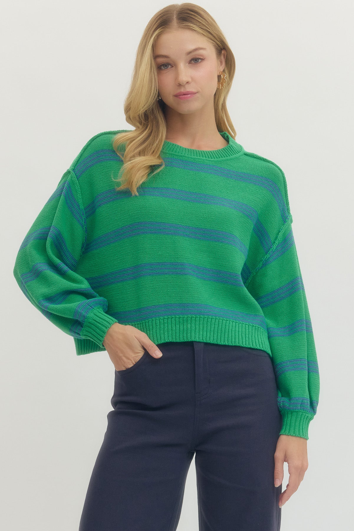 • Striped long sleeve knit sweater featuring ribbed neckline, cuffs & hem