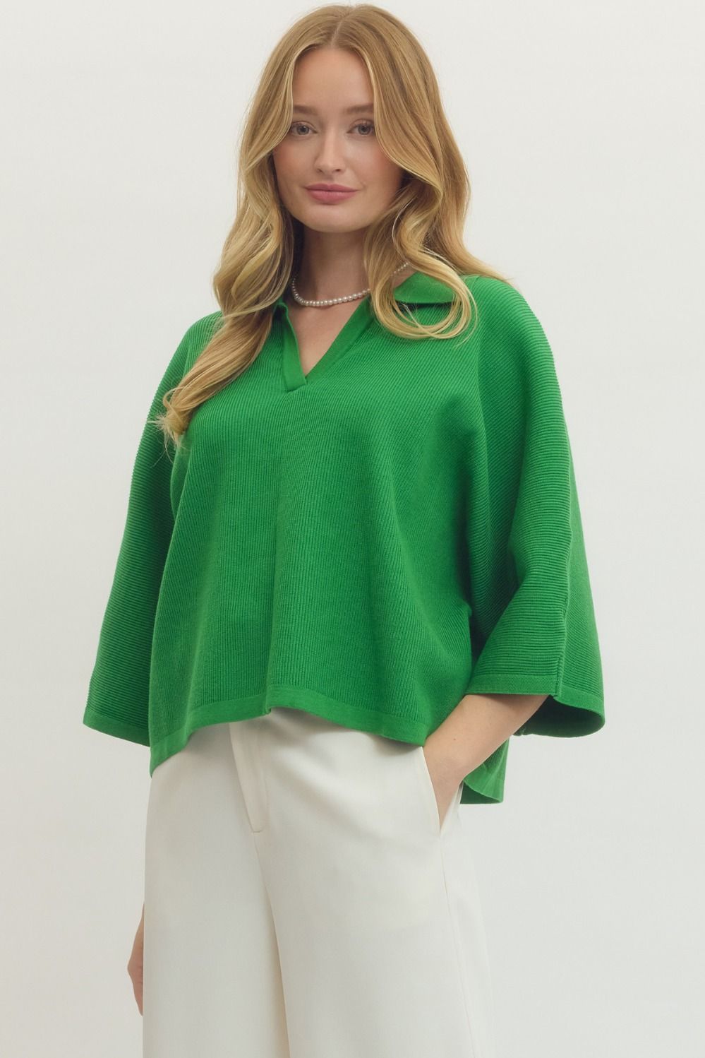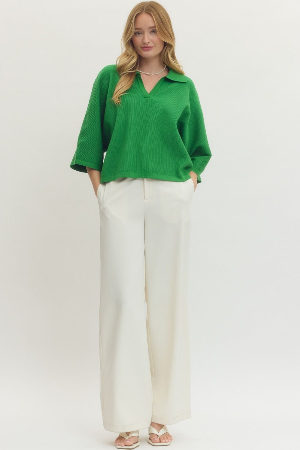 • Solid 3/4 sleeve knit top featuring open V-neck collar