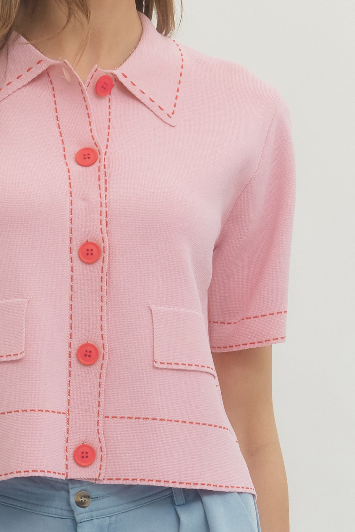 • Solid short sleeve knit jacket featuring contrast stitch trim & button closure at front