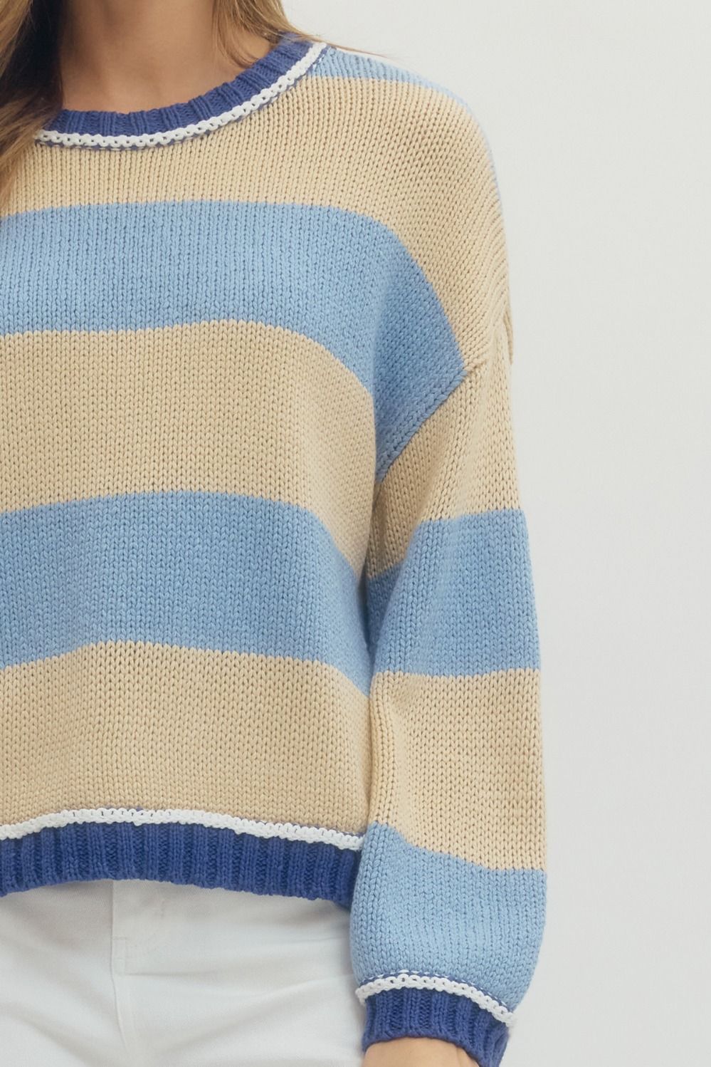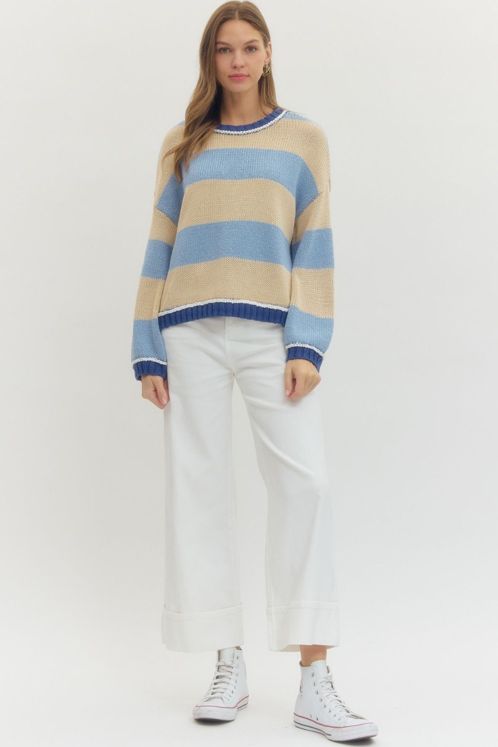 • Multicolor long sleeve knit top featuring bold stripe pattern