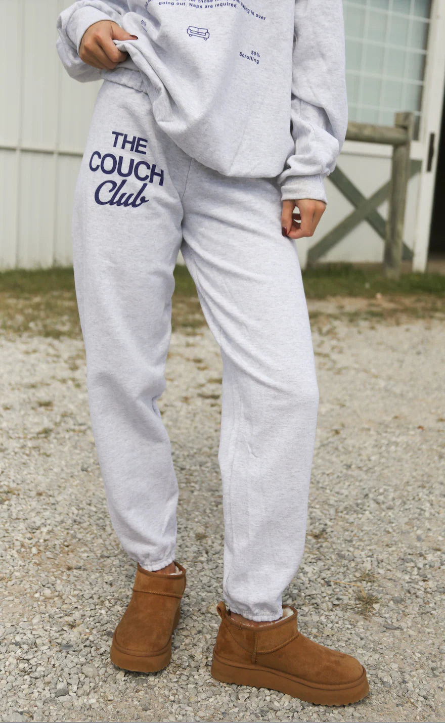 Meet the sweatpants you’ll actually cancel plans for. These ash grey joggers feature a relaxed fit, comfy elastic waist, and a bold blue “The Couch Club” graphic down the leg. Perfect for pairing with the matching sweatshirt or rocking solo, these graphic sweatpants are made for Netflix marathons, weekend errands, and everything in between.