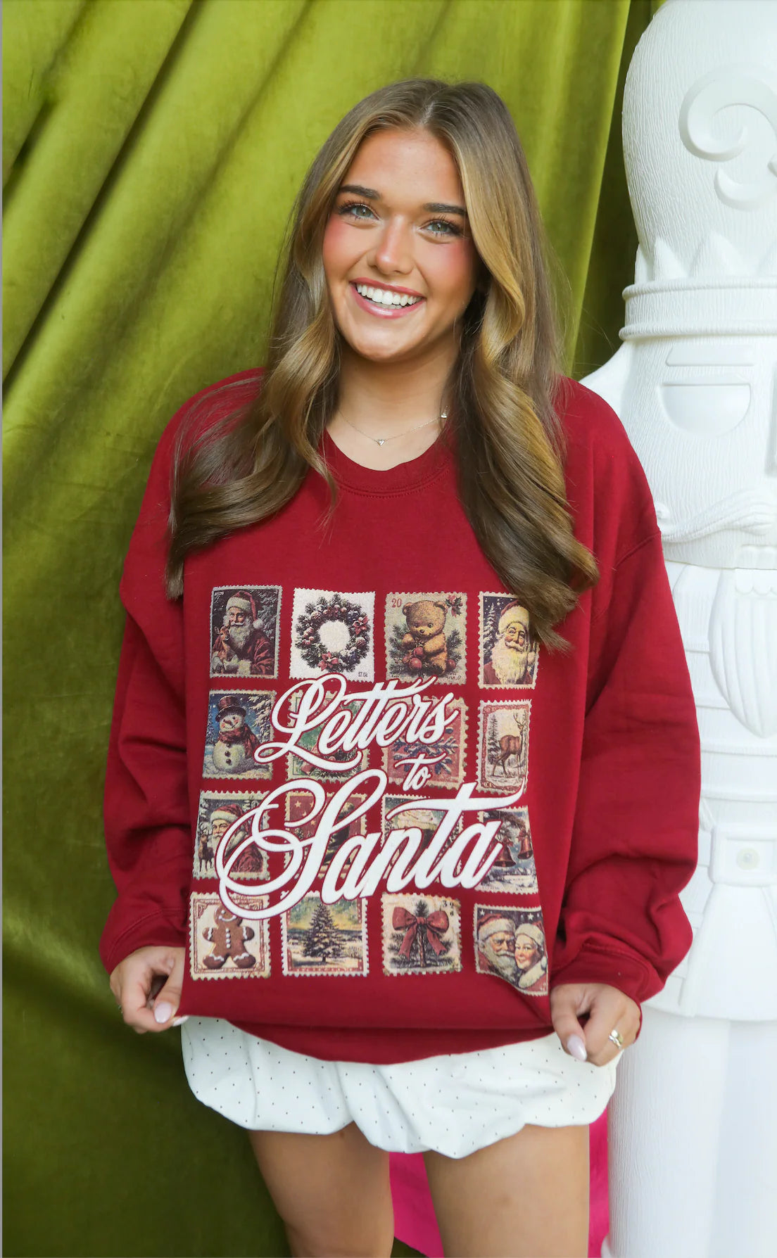 Our holiday favorite is back! This dark red crewneck features “Letters to Santa” in classic script with vintage-style holiday stamps for a nostalgic festive vibe -cozy, charming, and perfect for lounging, gifting, or adding a touch of holiday magic to your wardrobe.