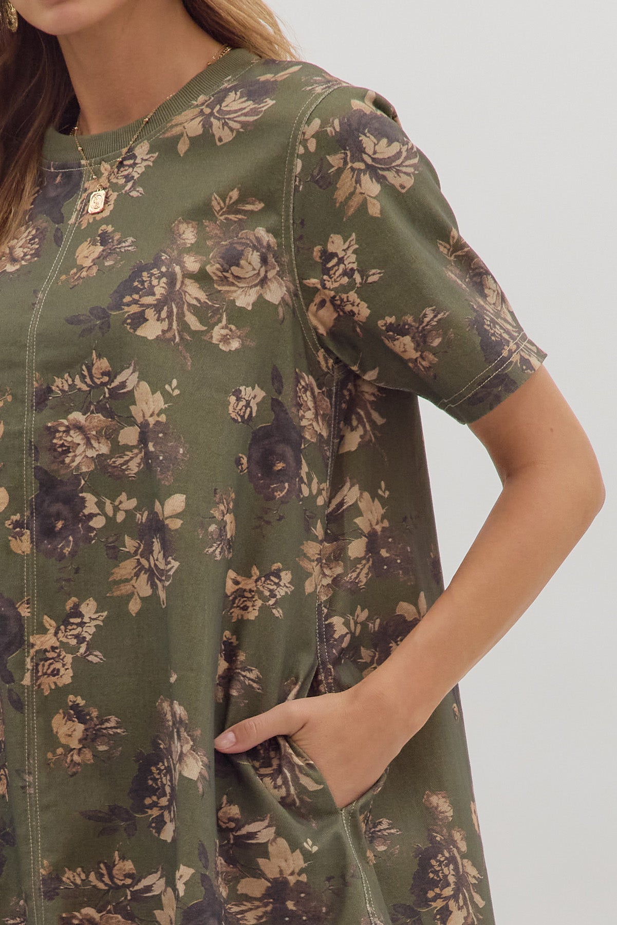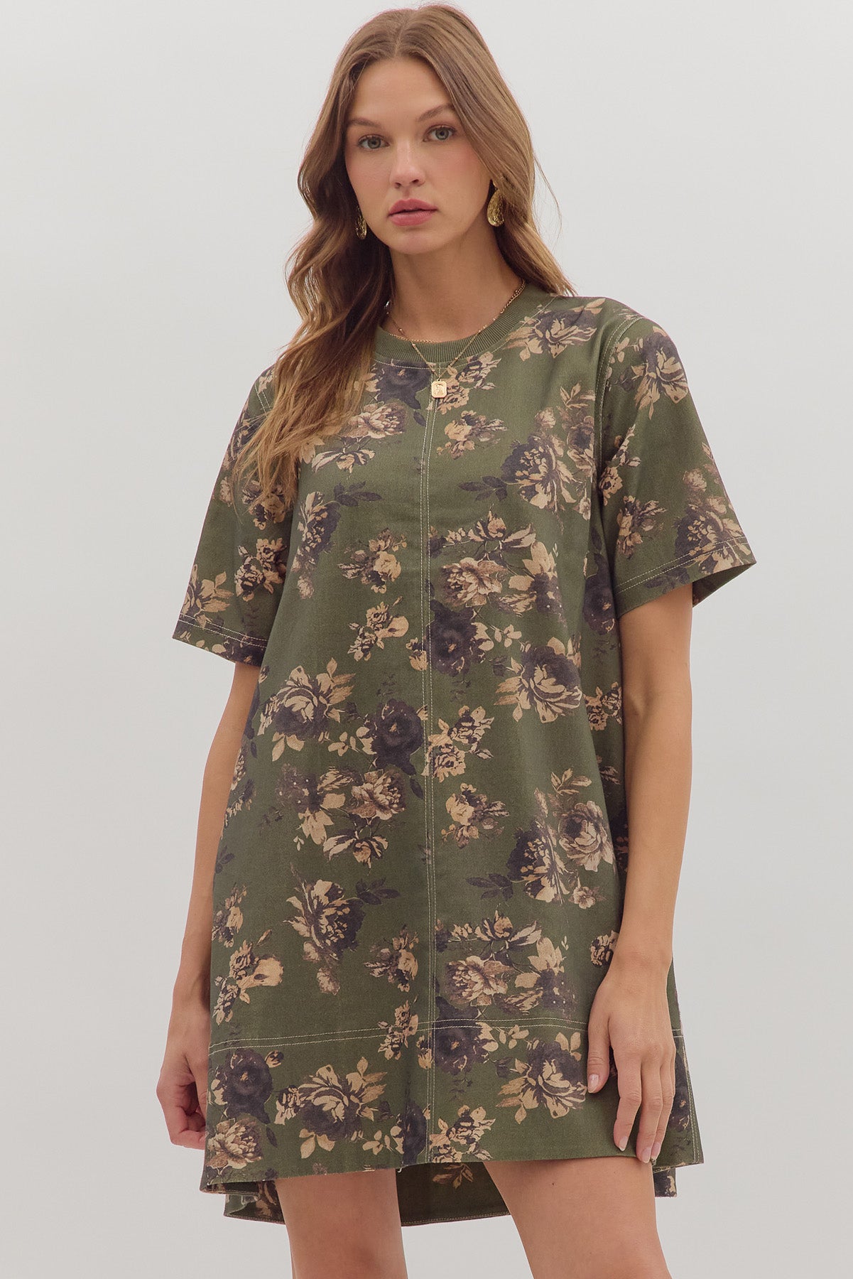 • Floral print short sleeve mini dress featuring contrast topstitch detail