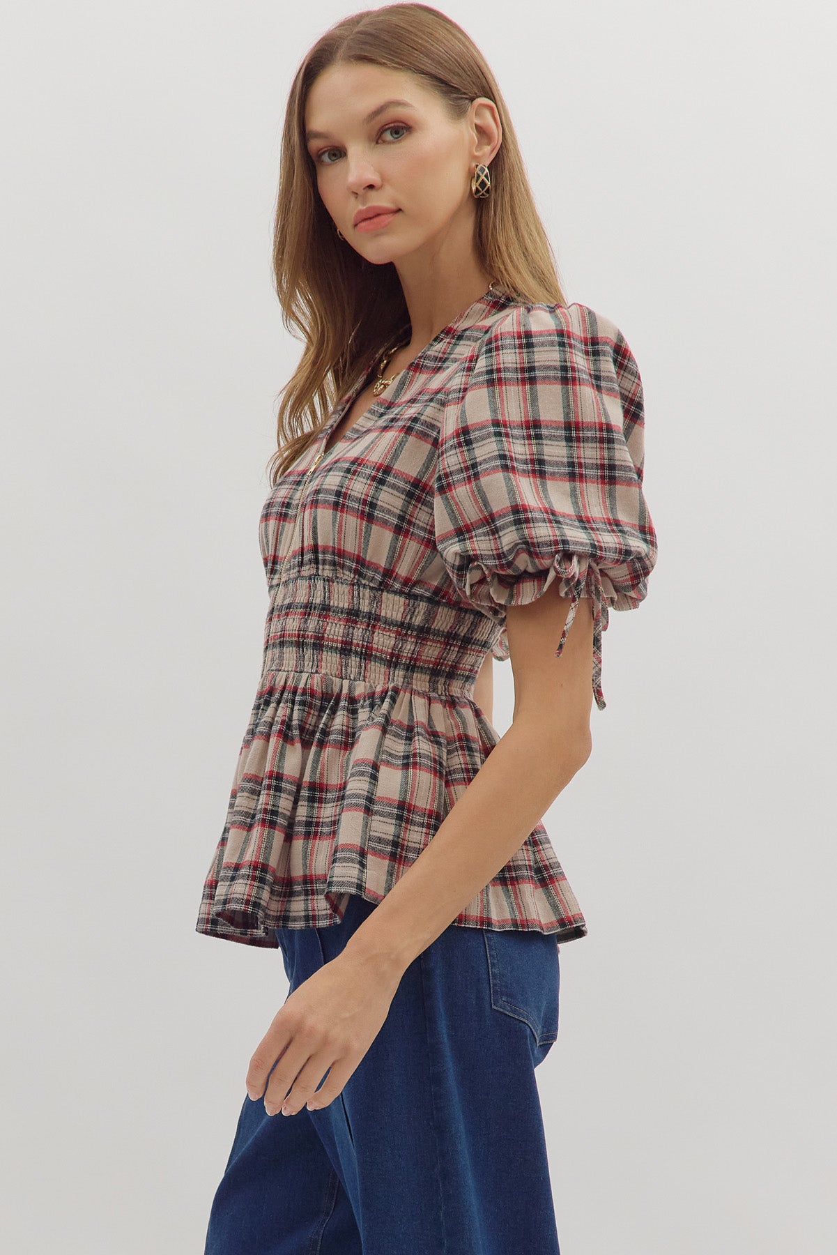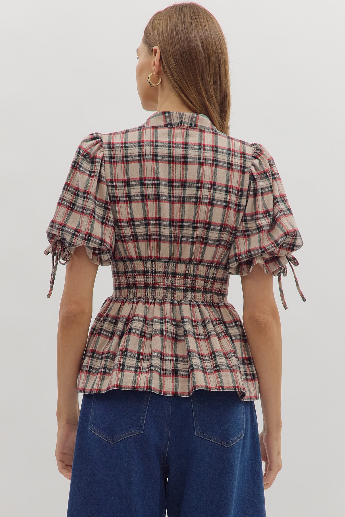 • Plaid short puff sleeve top featuring smocked waist and tie accents at sleeves