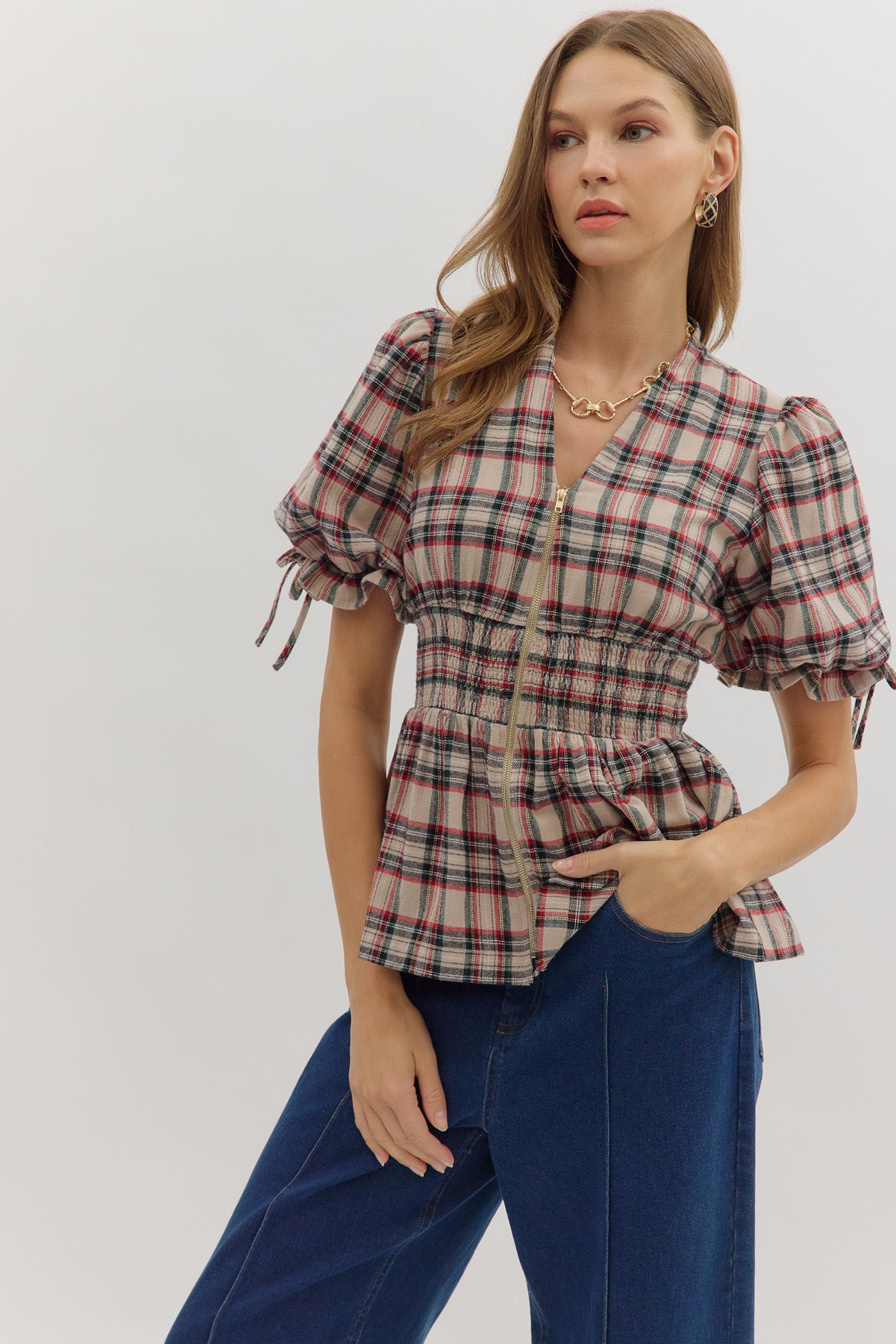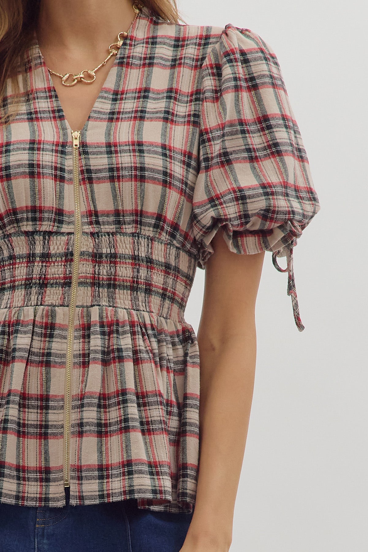 yuletide wishes plaid puff sleeve top - taupe
