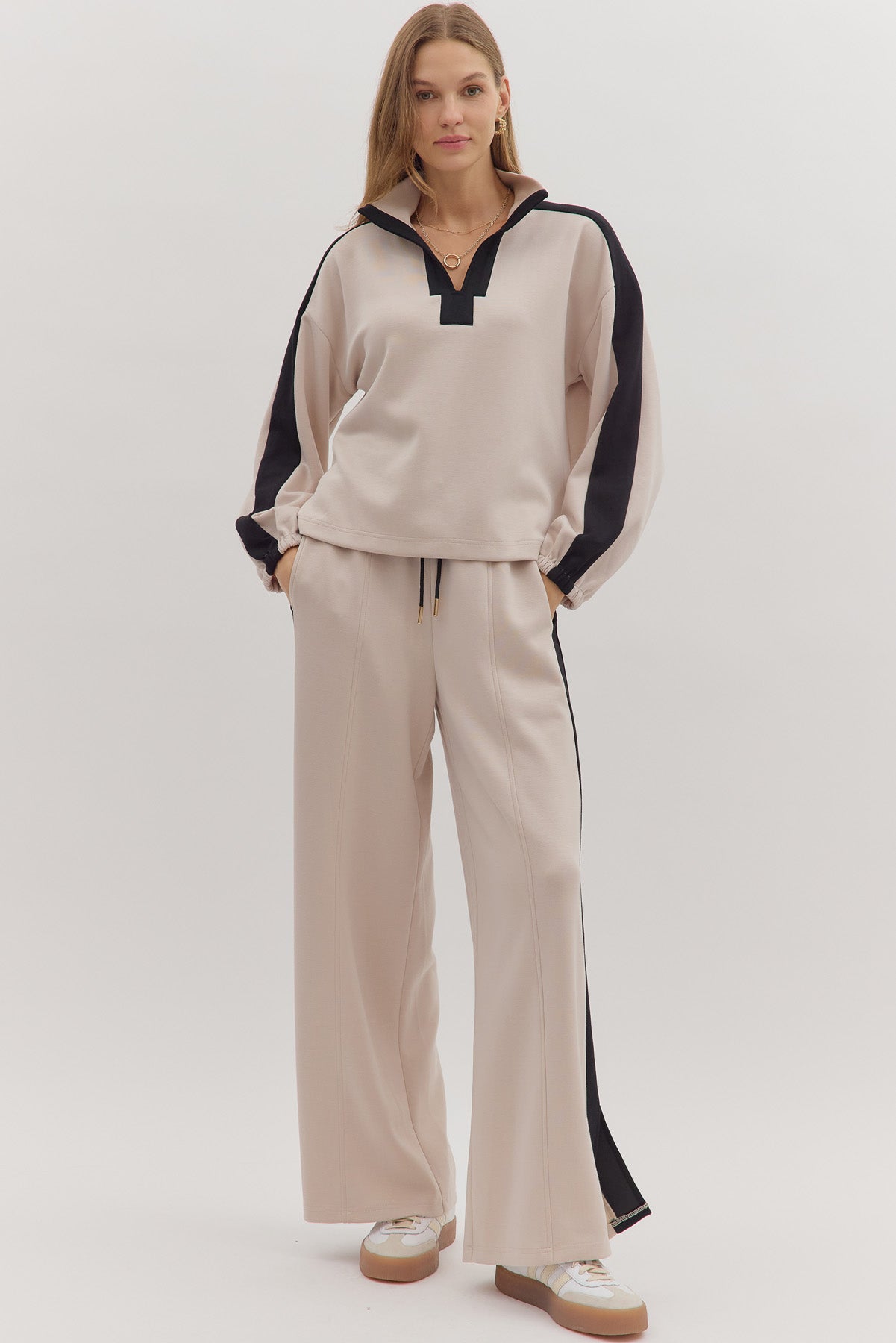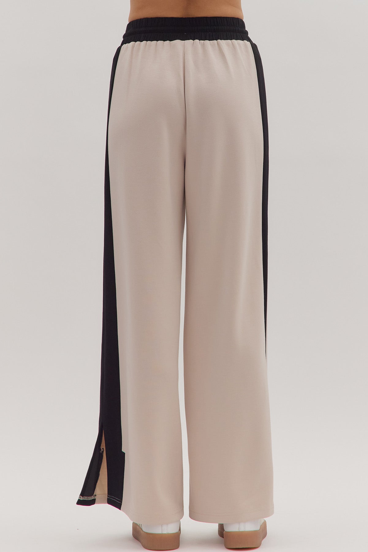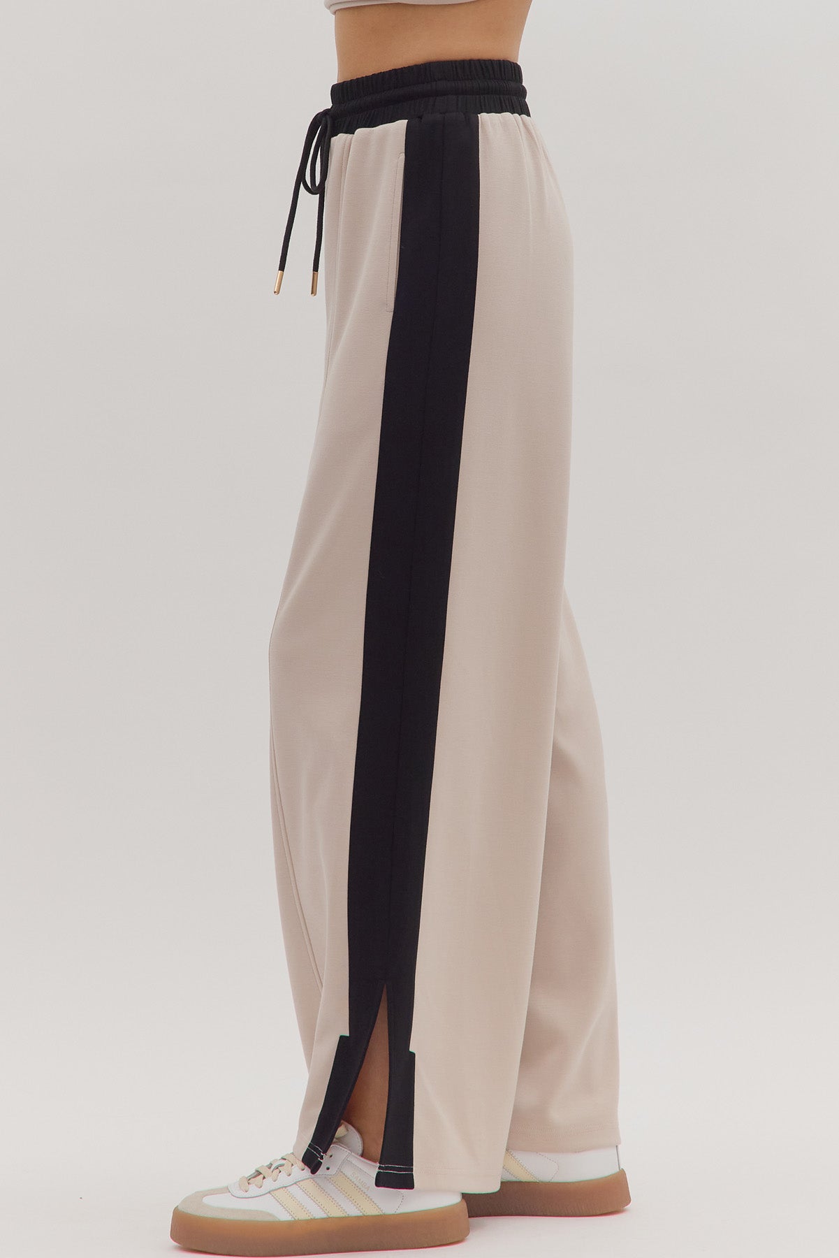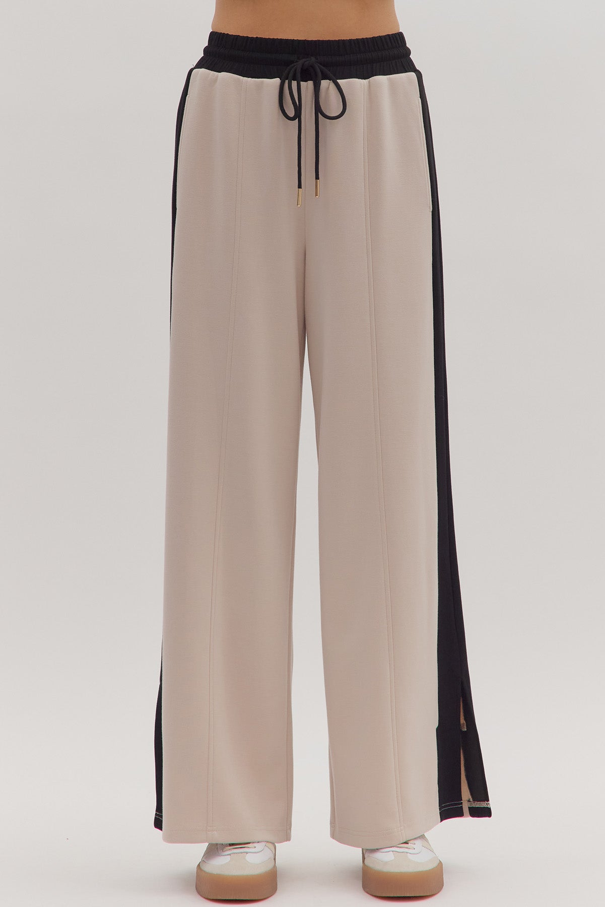 • Solid wide leg knit pants featuring elastic waistband with drawstring