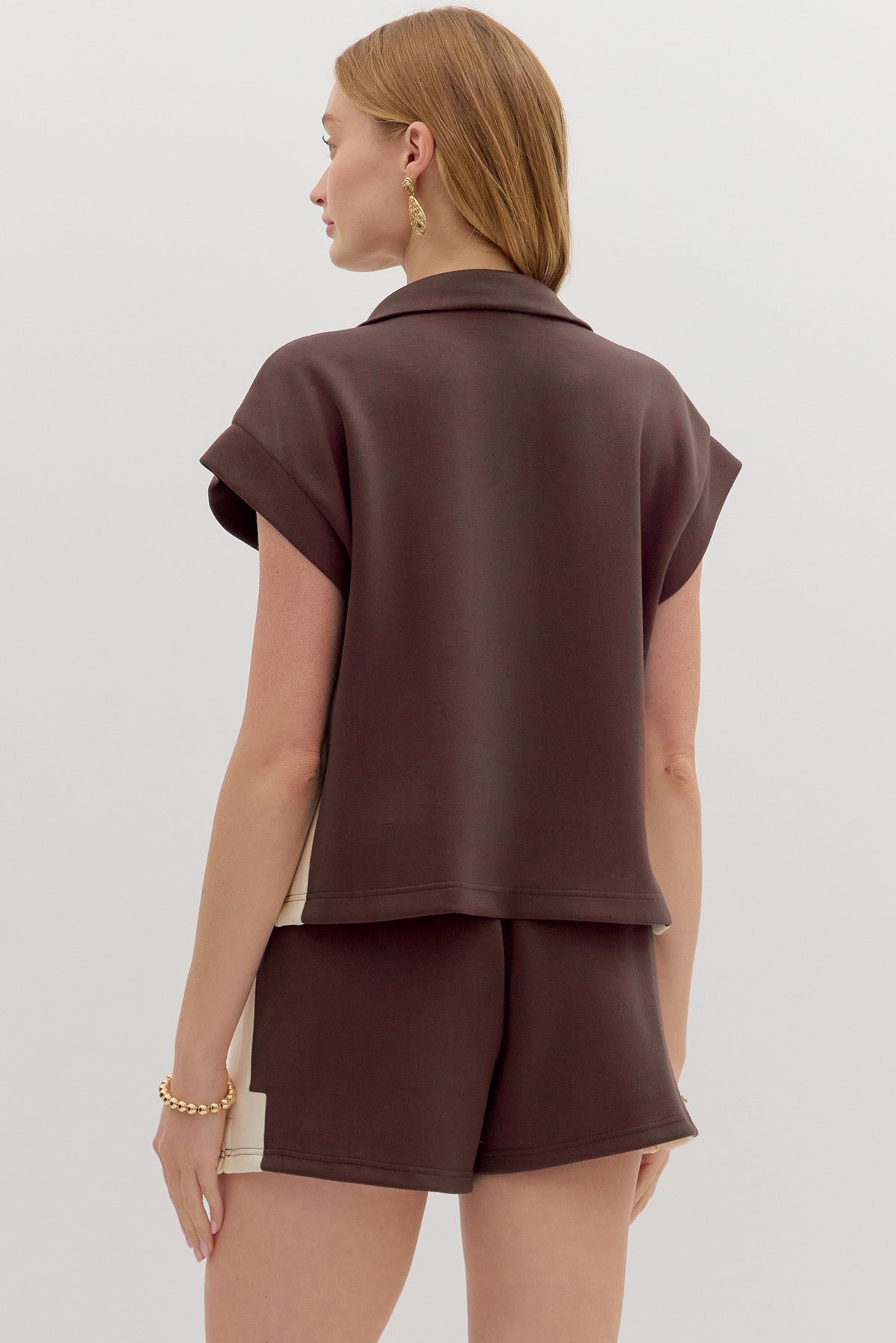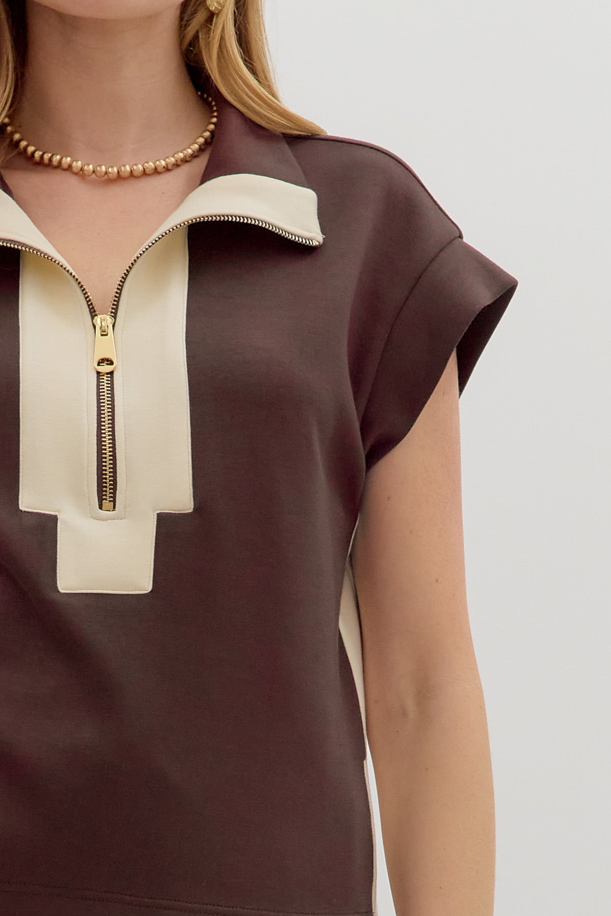 • Solid contrast accent zip-front pullover top featuring contrast side slit band