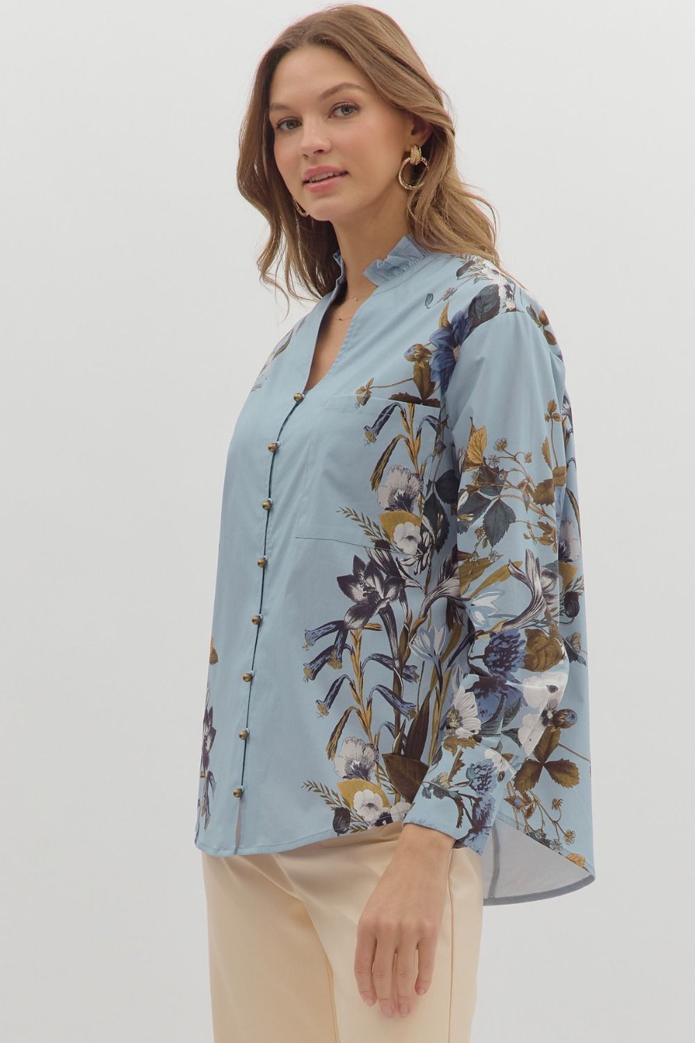 • Floral print long shirt sleeve top featuring floral accent sleeves