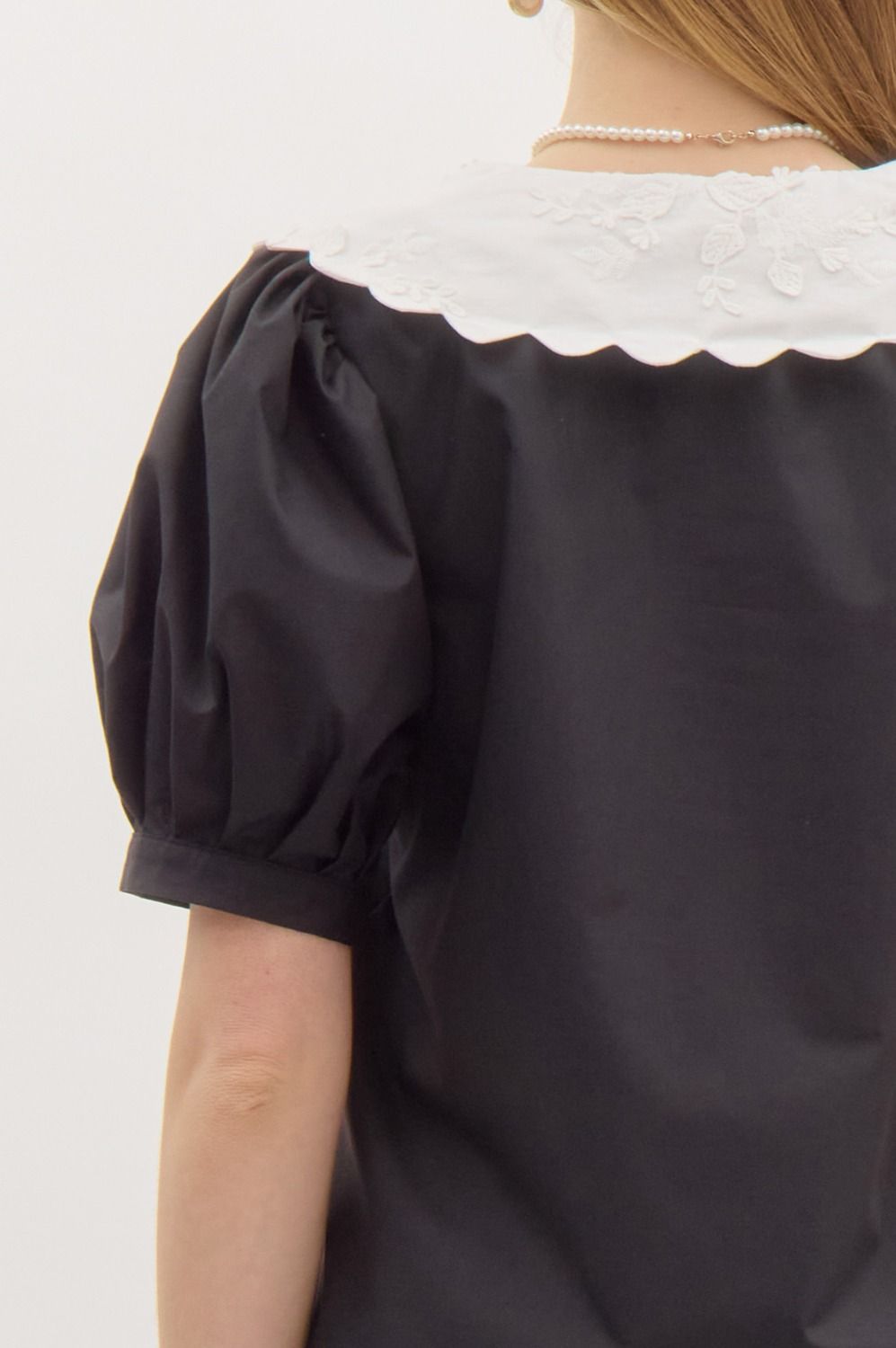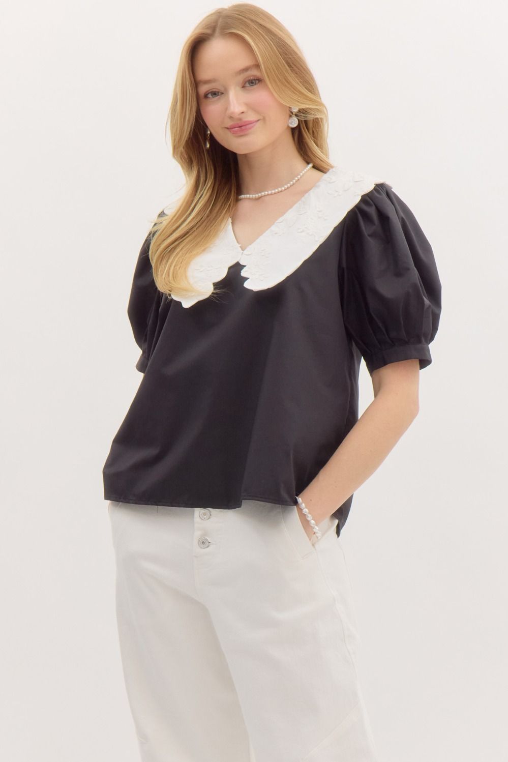 • Short puff sleeve top featuring scallop edge 3D floral applique collar