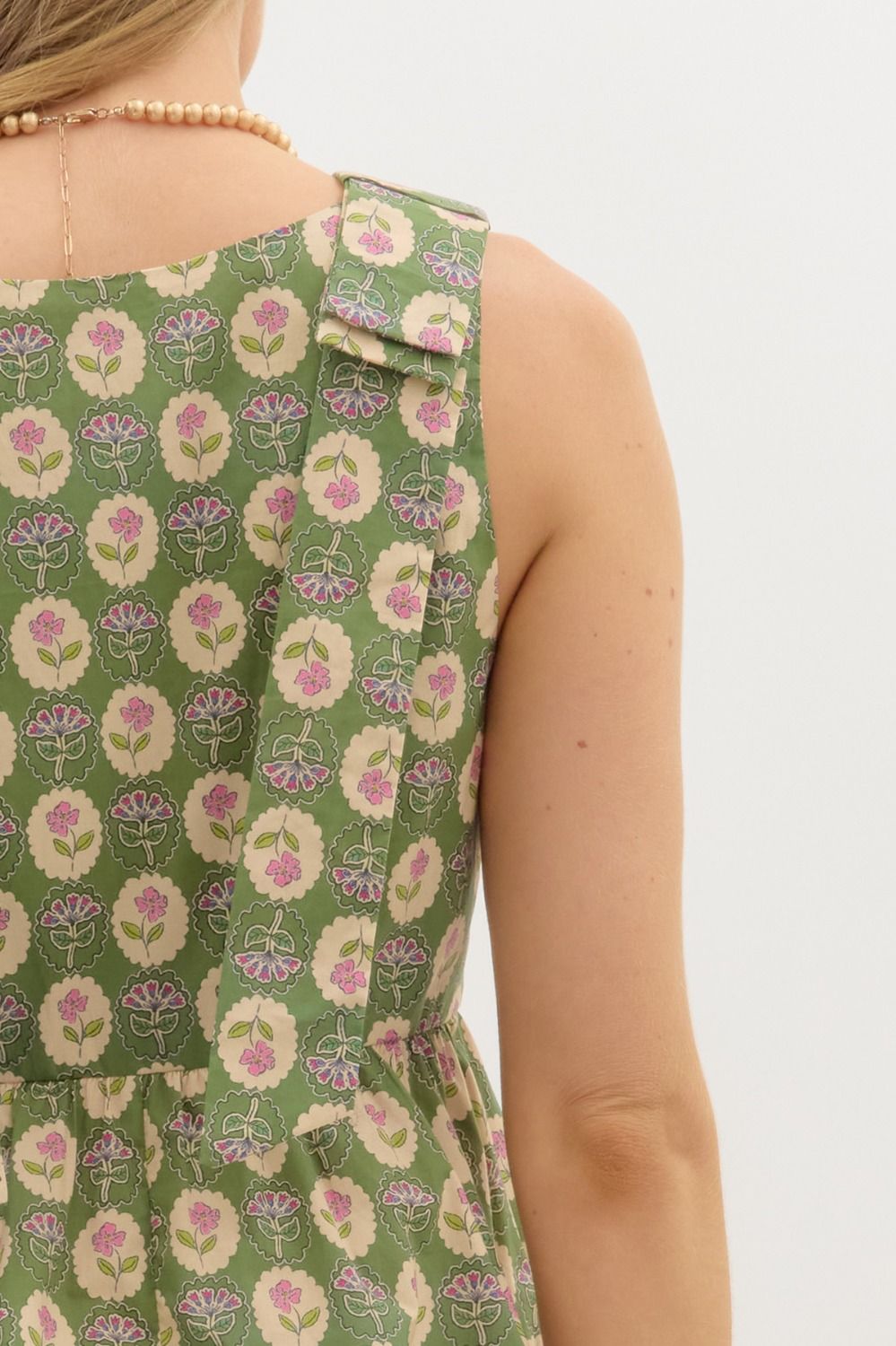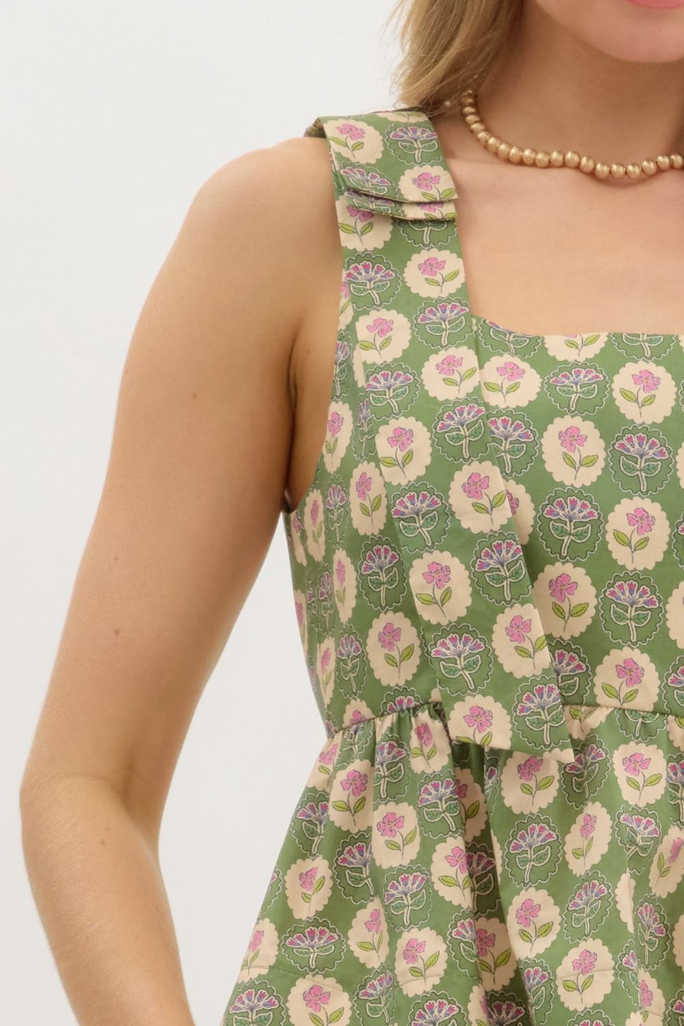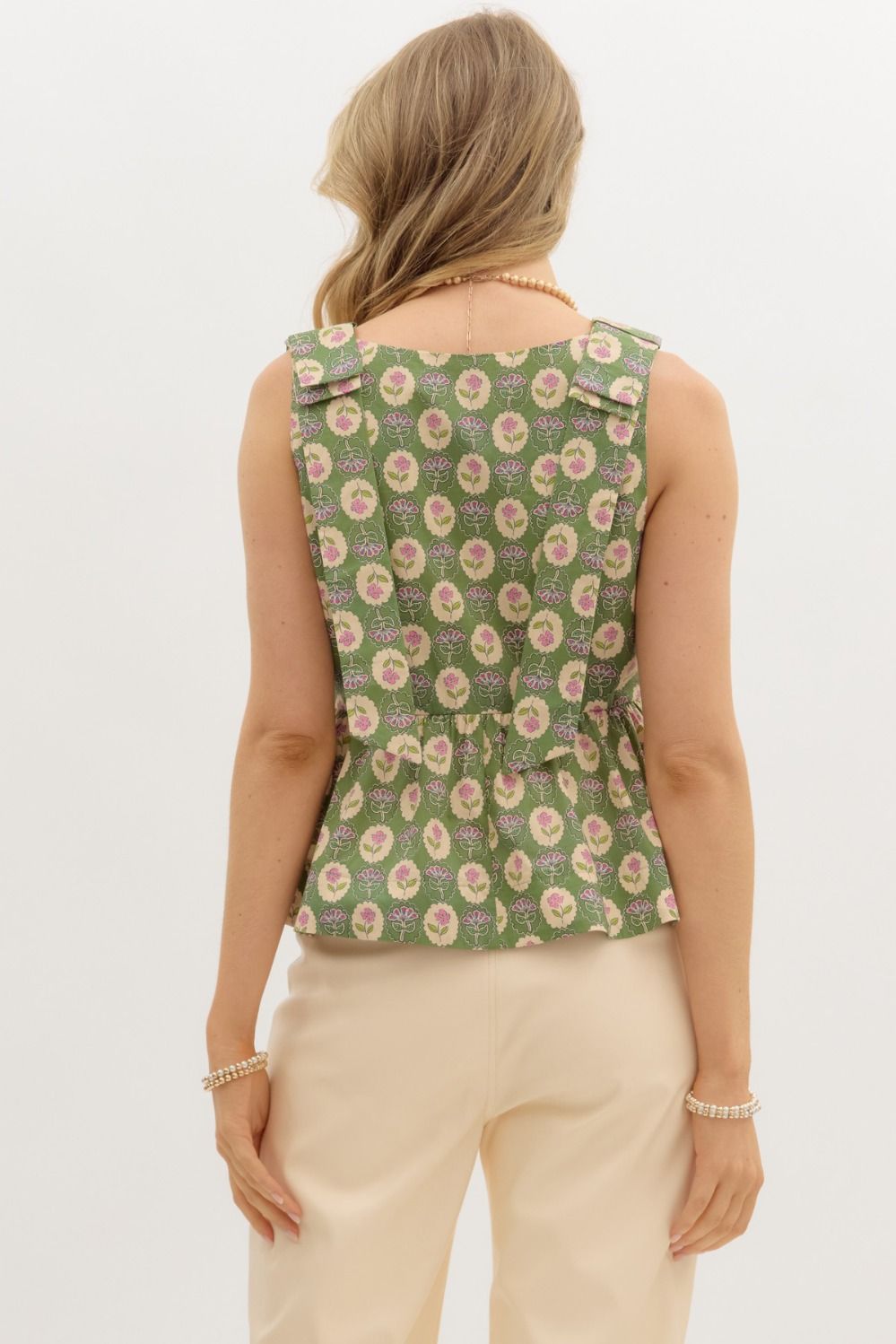 • Floral print square neck ruffle hem top featuring accented bow tie finish shoulder
