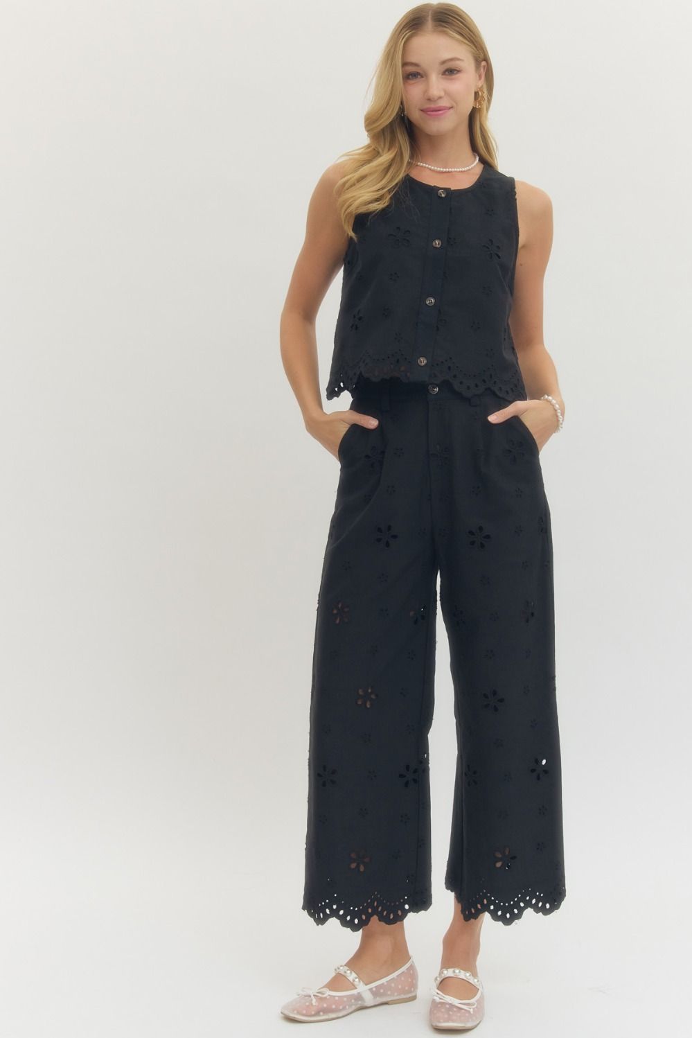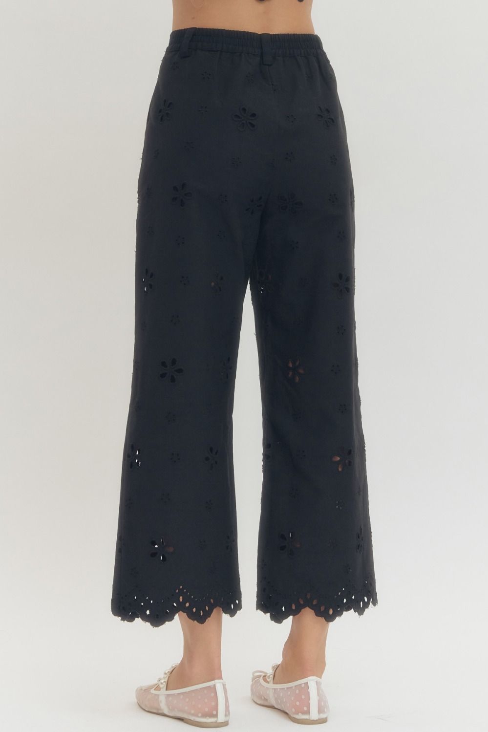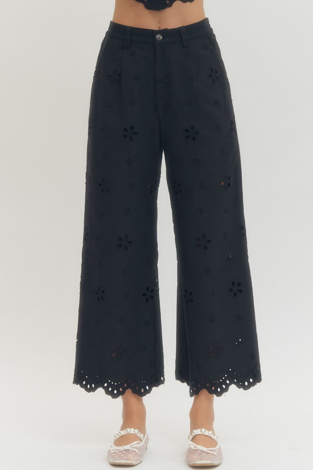 • Eyelet embroidered wide leg pants featuring scallop hem