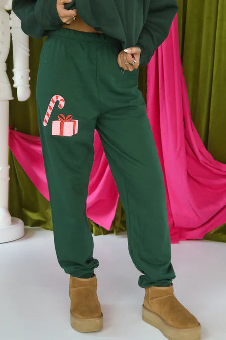 Complete your festive look! These green joggers coordinate perfectly with the Merry & Bright sweatshirt and feature playful pink and red candy cane and present details.