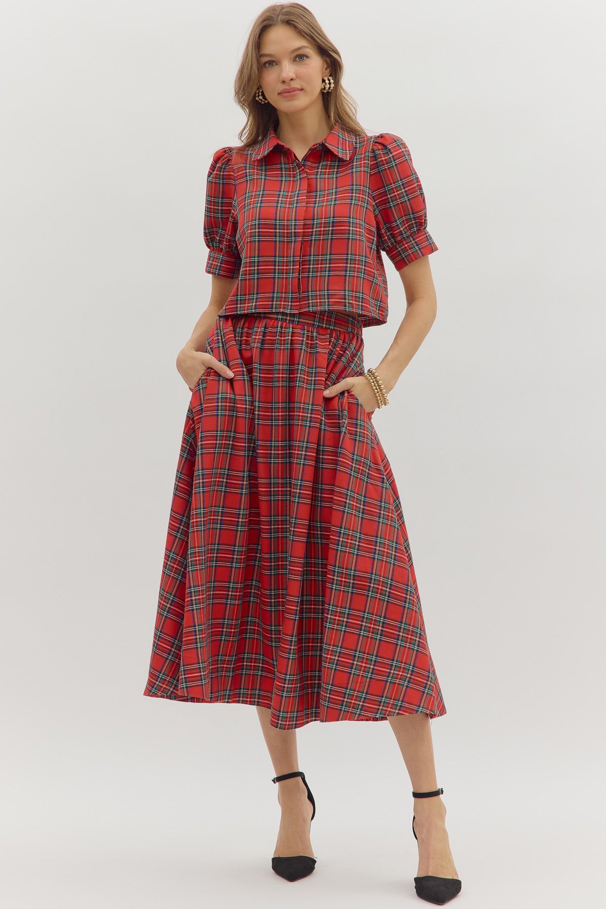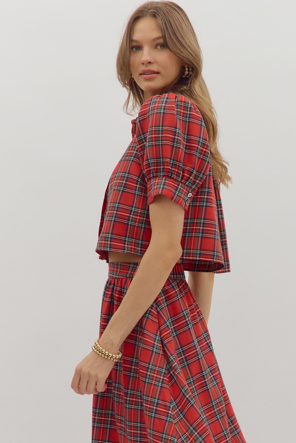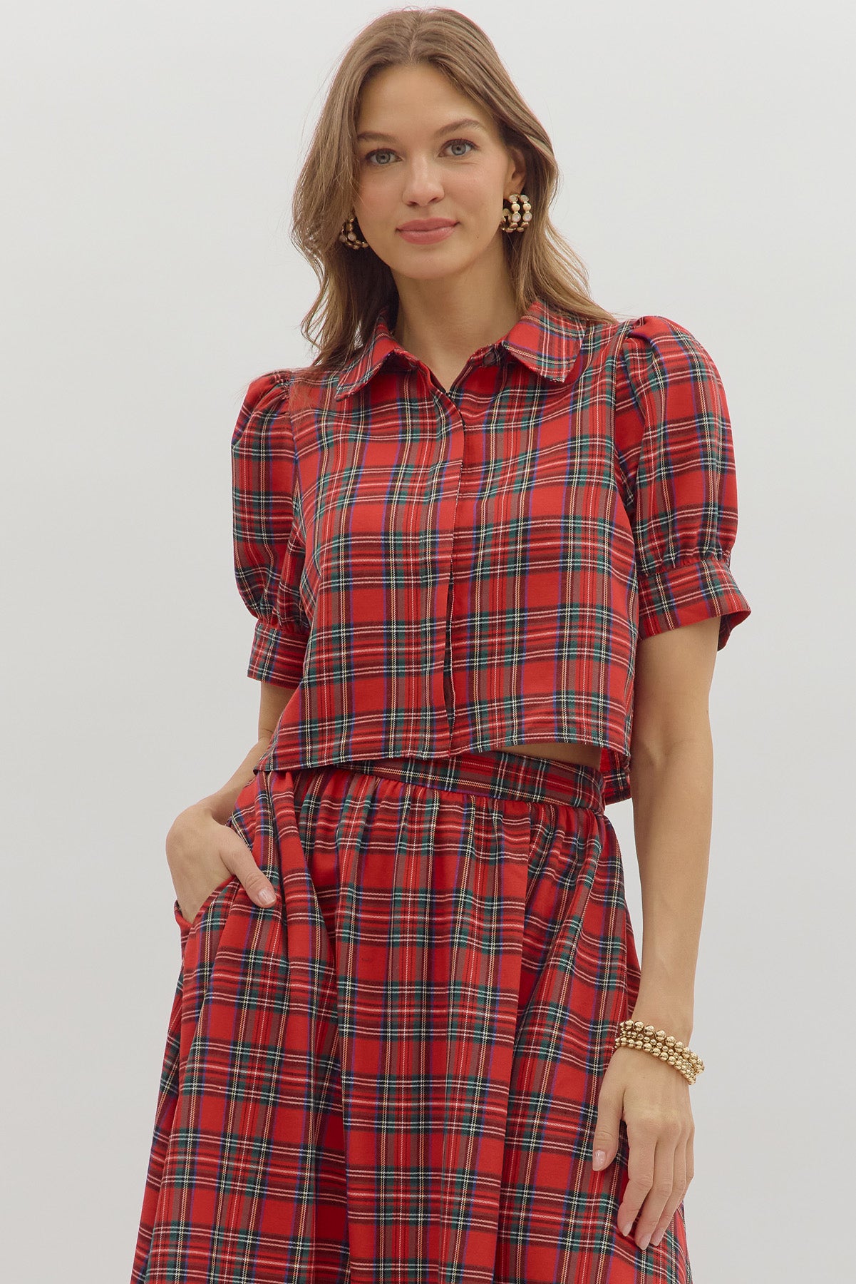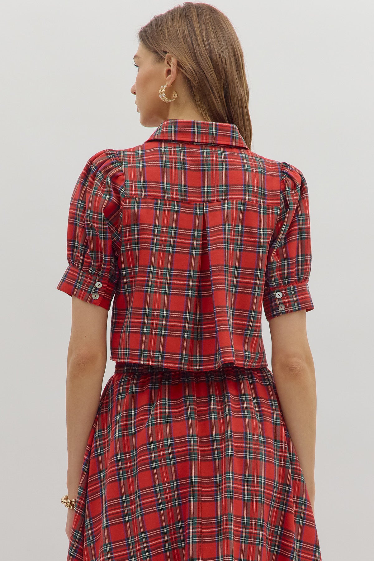 • Plaid pattern waist-length collar button closure cuff band short sleeve top