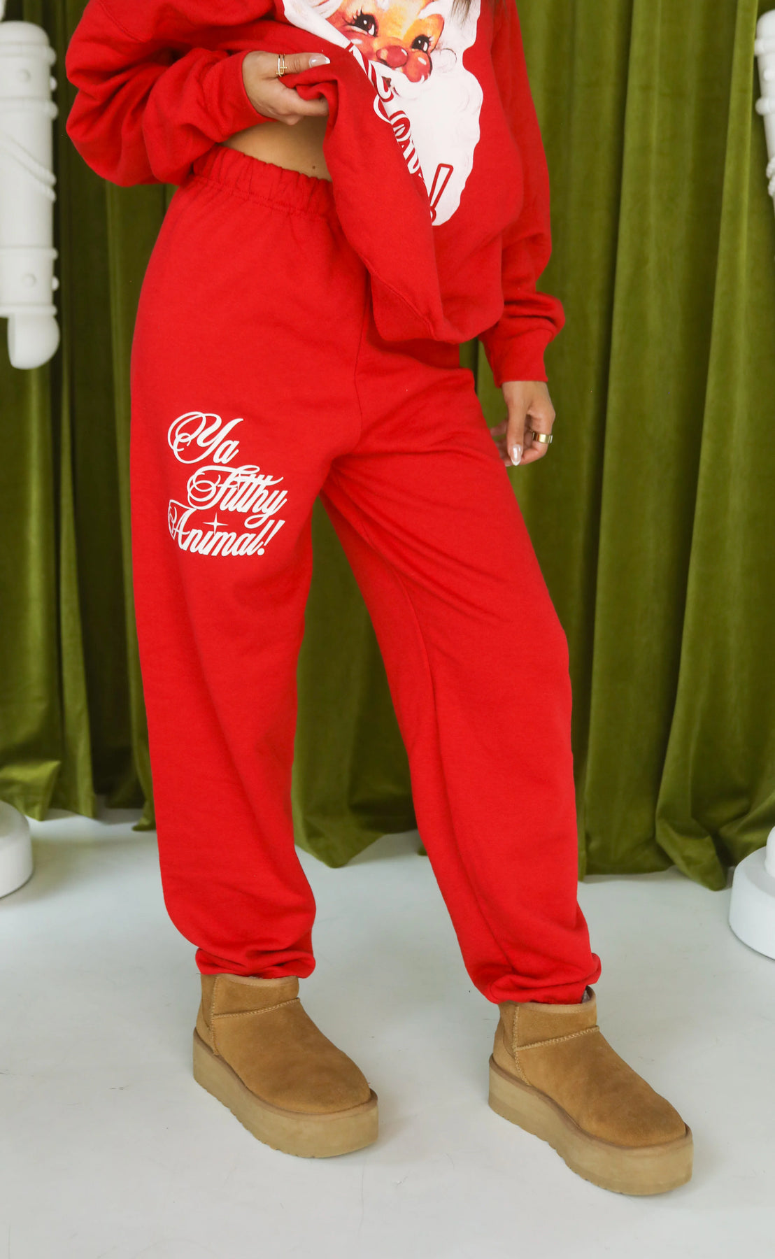Complete the ultimate holiday set! These red pull-on joggers pair perfectly with the Vintage Santa Crewneck and feature “Ya Filthy Animal” in playful white script - cozy, cheeky, and made for lounging, gifting, or holiday movie marathons.