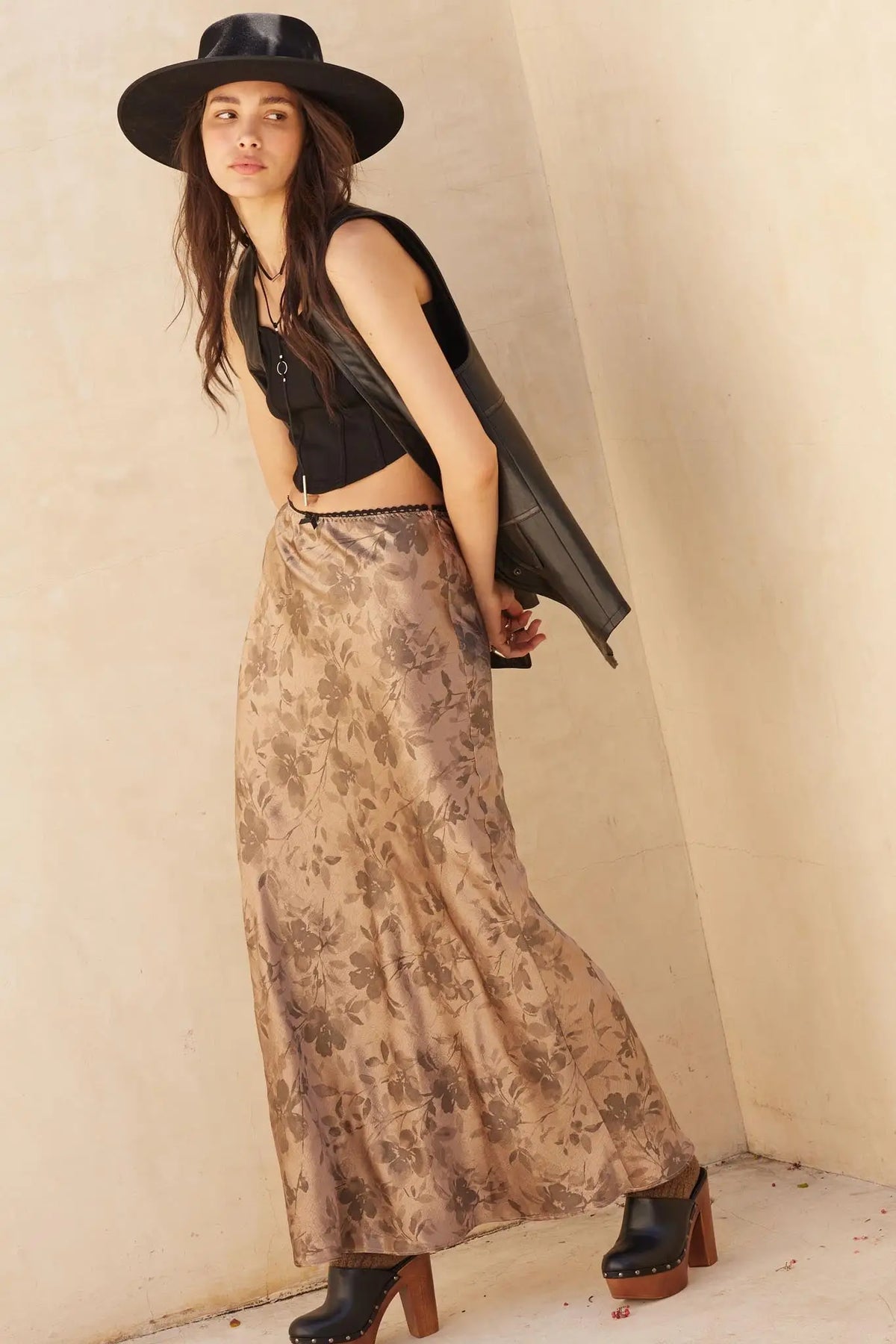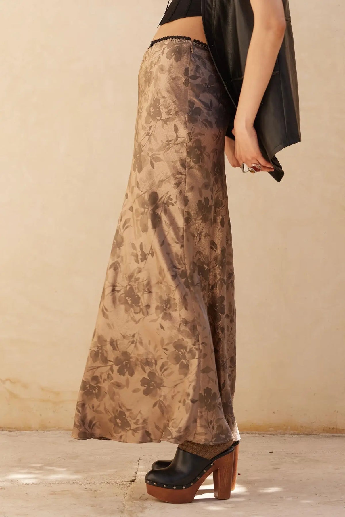 flashy flowers satin maxi skirt- taupe