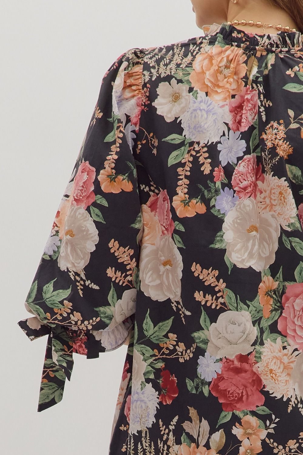 • Floral print 3/4 bubble sleeve mini dress featuring fixed bow accent ruffle V-neck