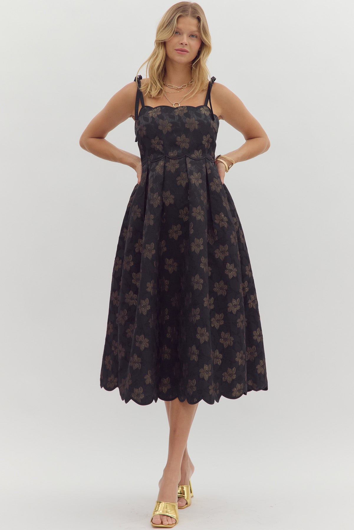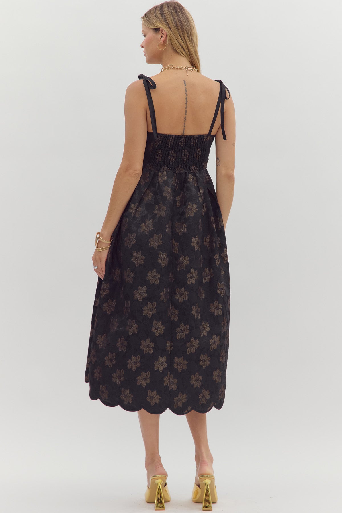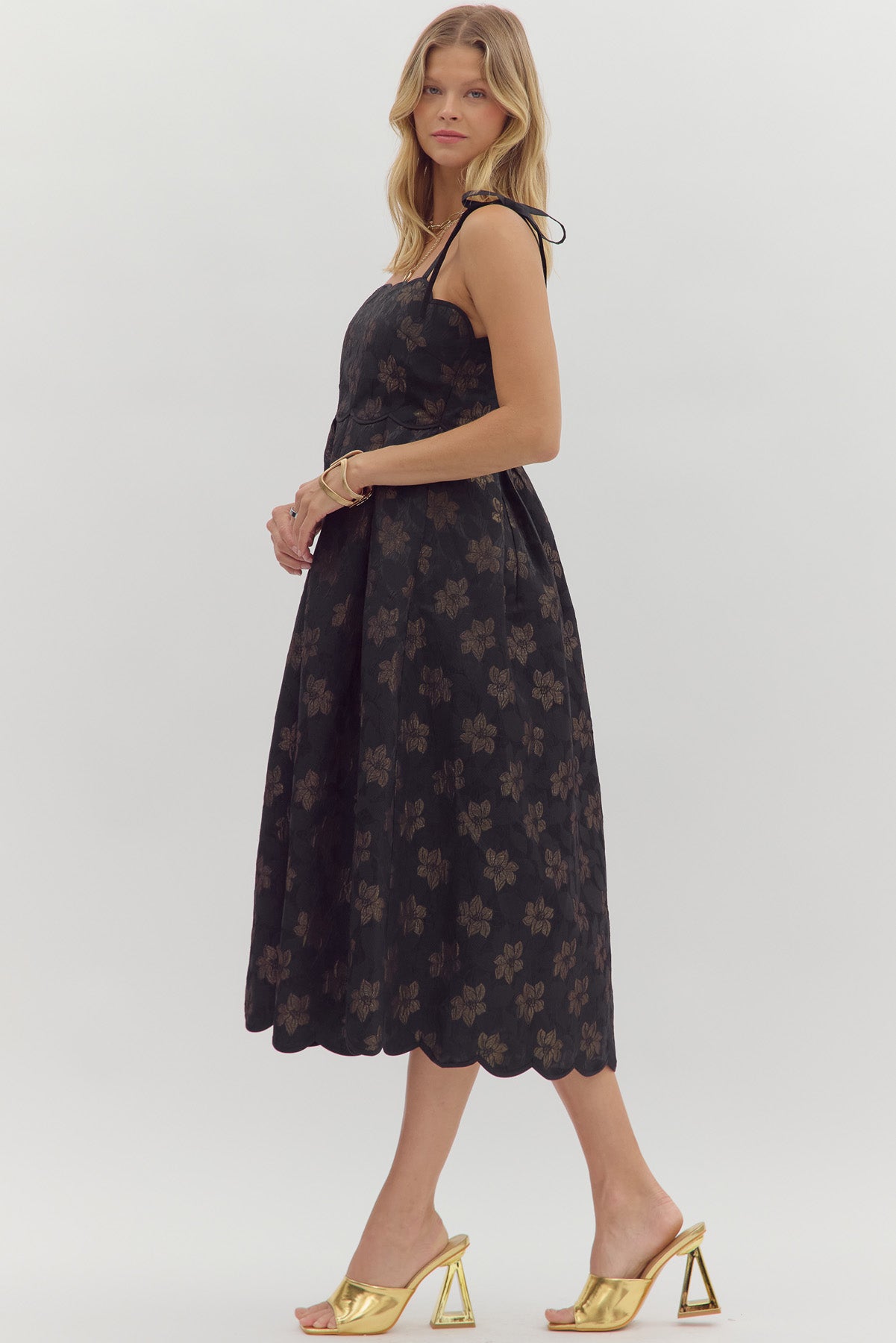 • Floral jacquard pattern tie shoulder midi dress
