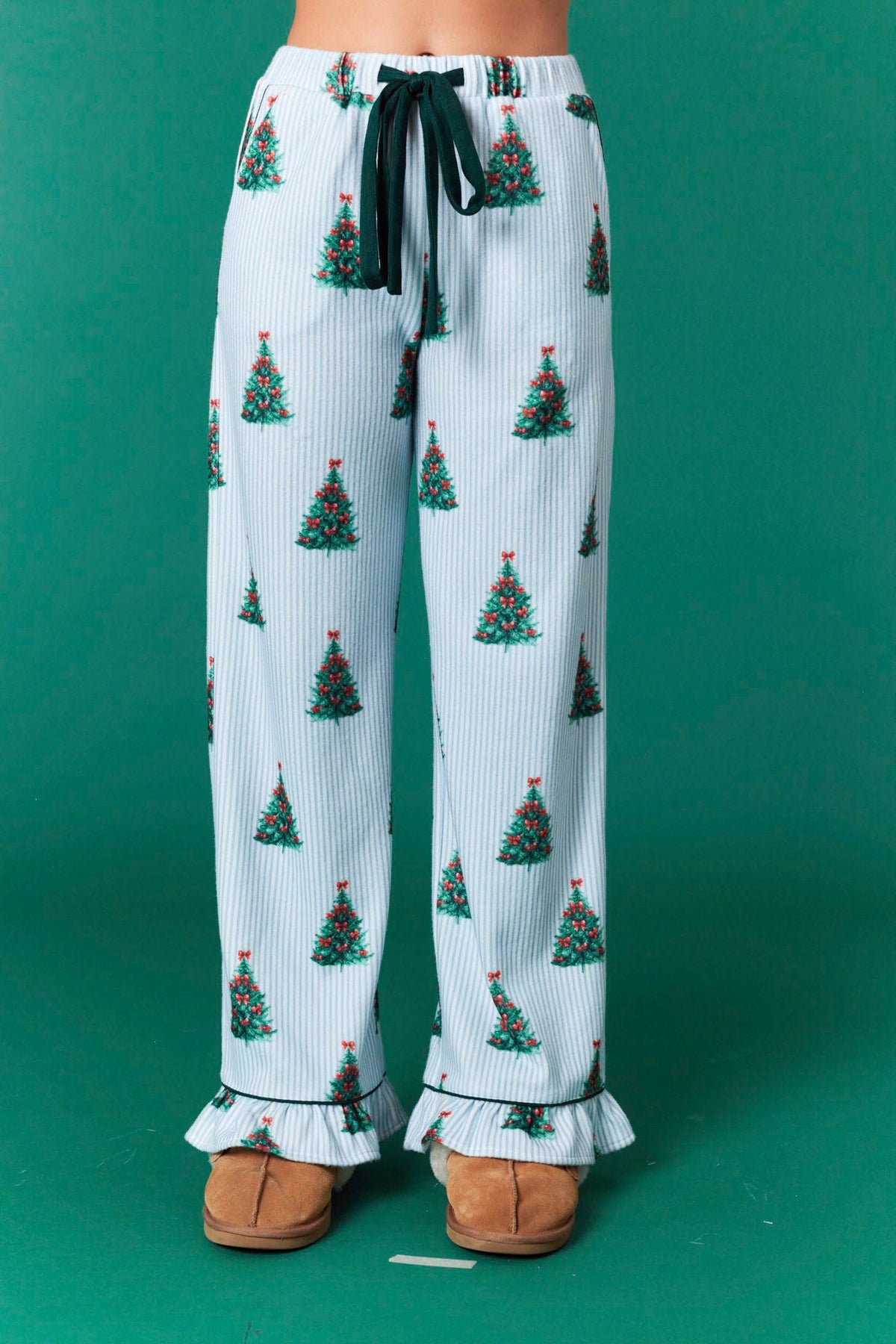 • Stripes with Christmas tree printed & piping detail brushed knit pajamas