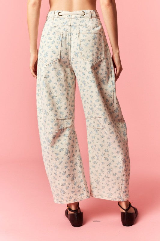 • Floral printed waist tie detail denim pants