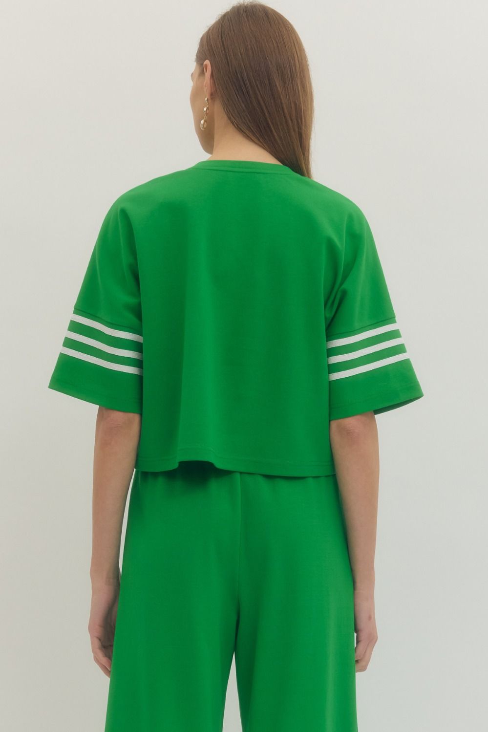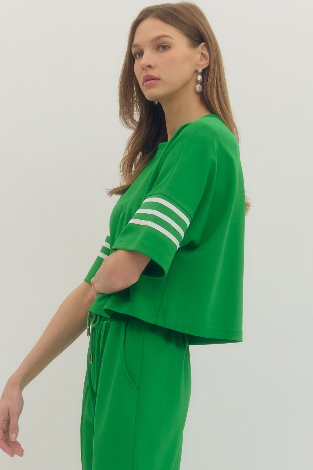 • Solid short sleeve knit top featuring contrast stripe detail at sleeves