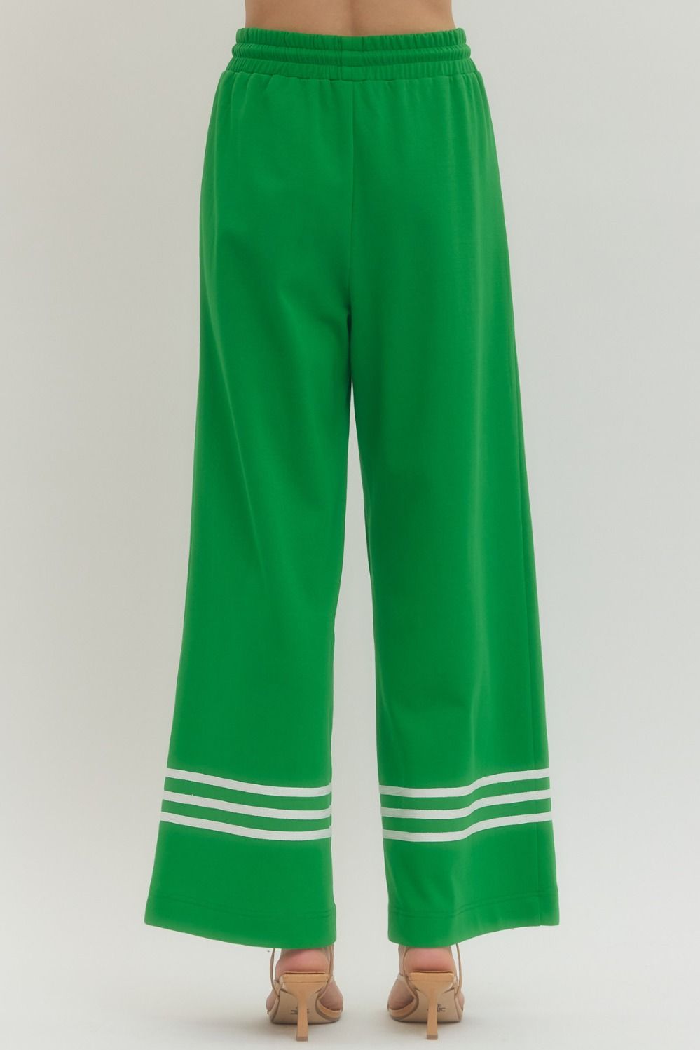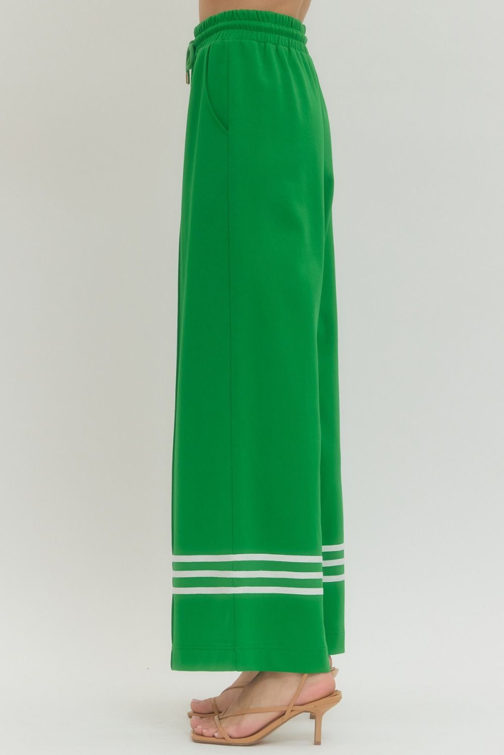 • Solid elastic waist wide leg pants featuring contrast stripe detail at hem