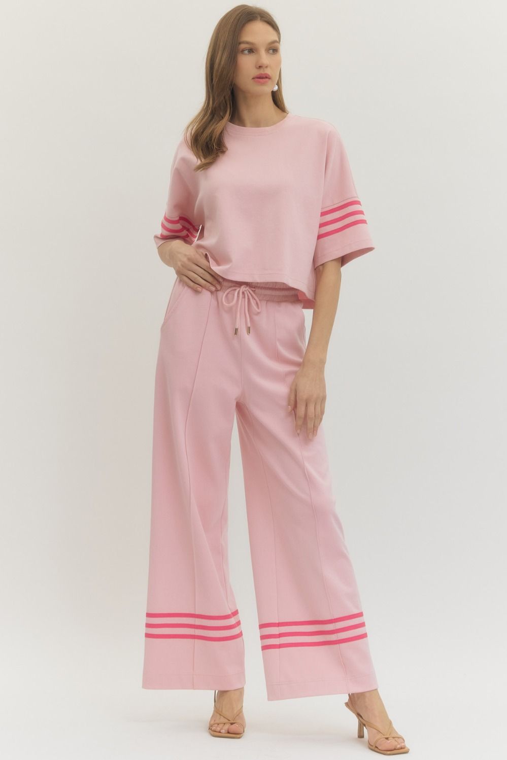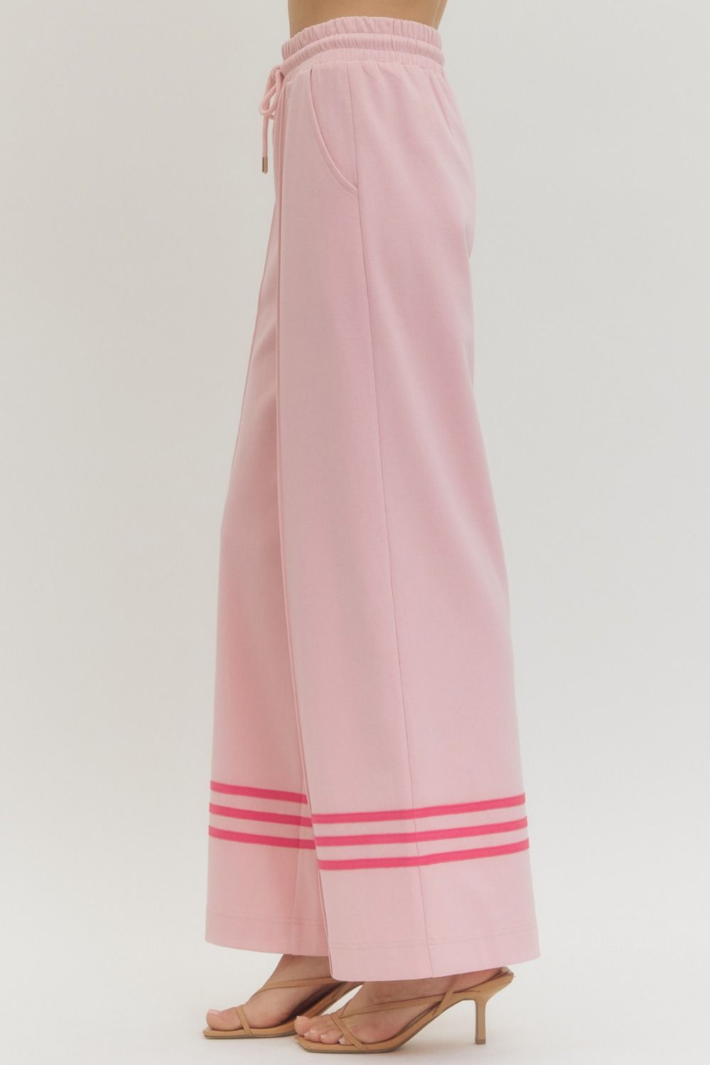 • Solid elastic waist wide leg pants featuring contrast stripe detail at hem