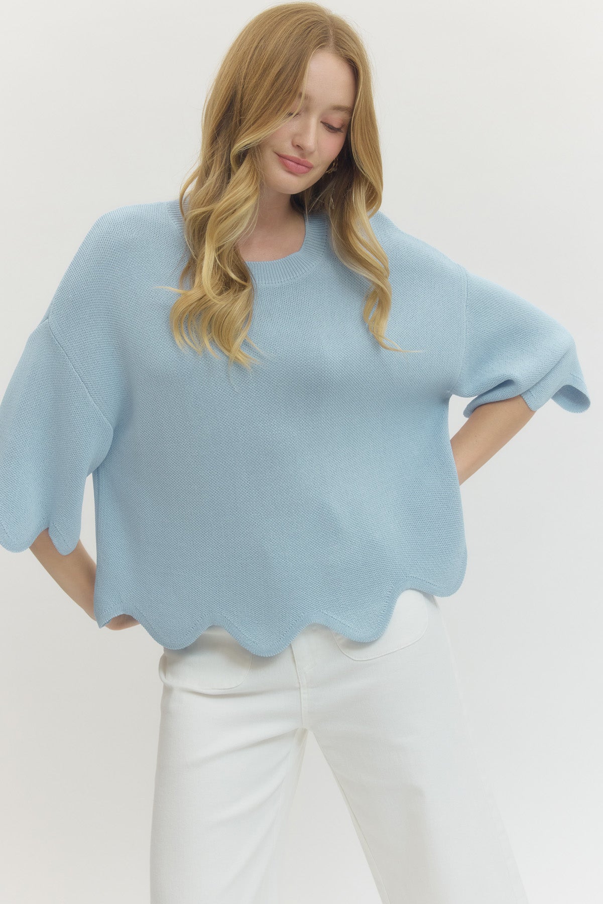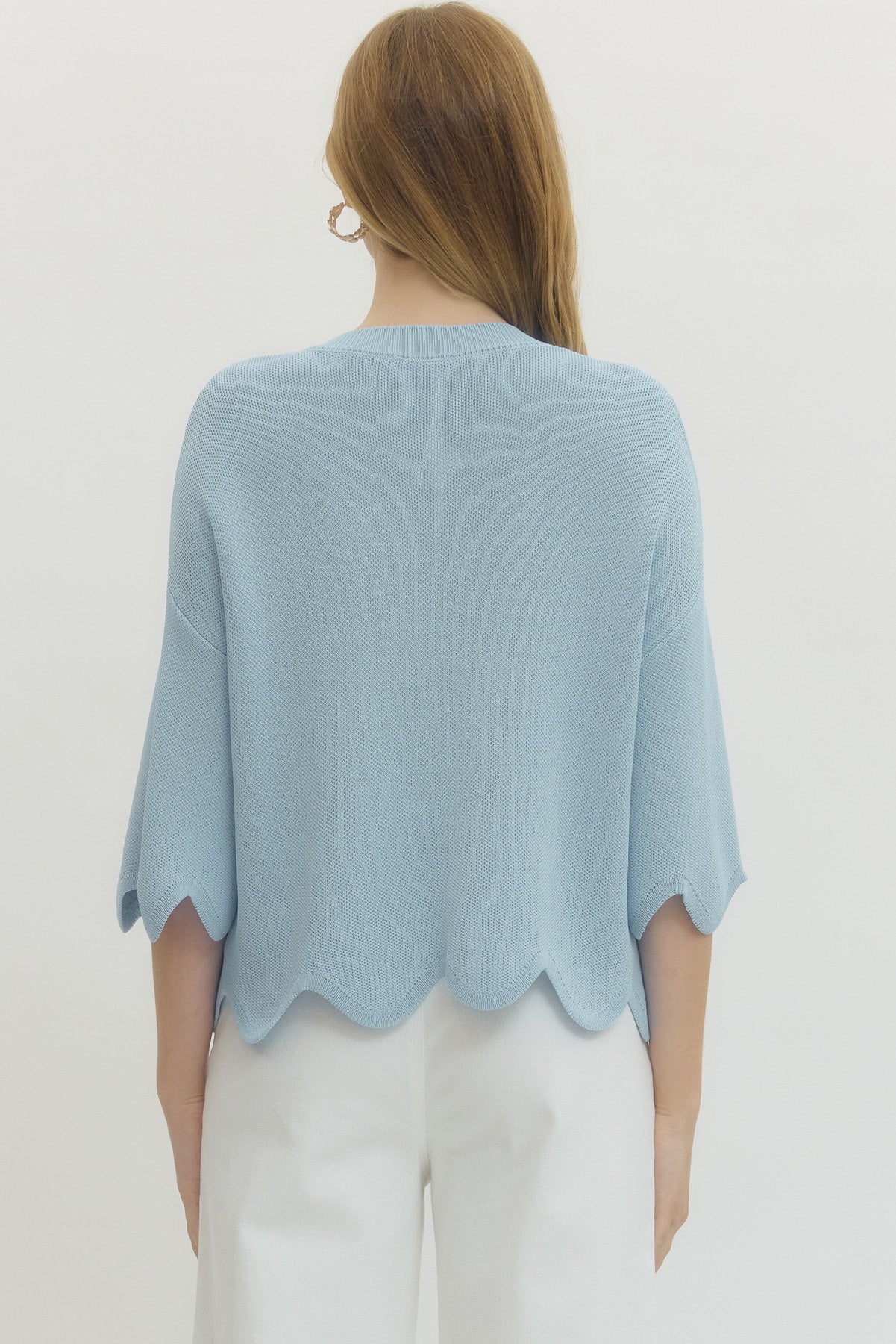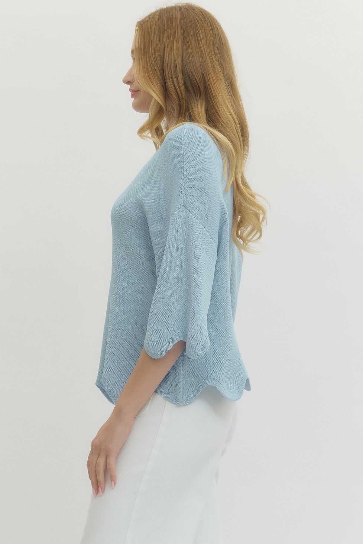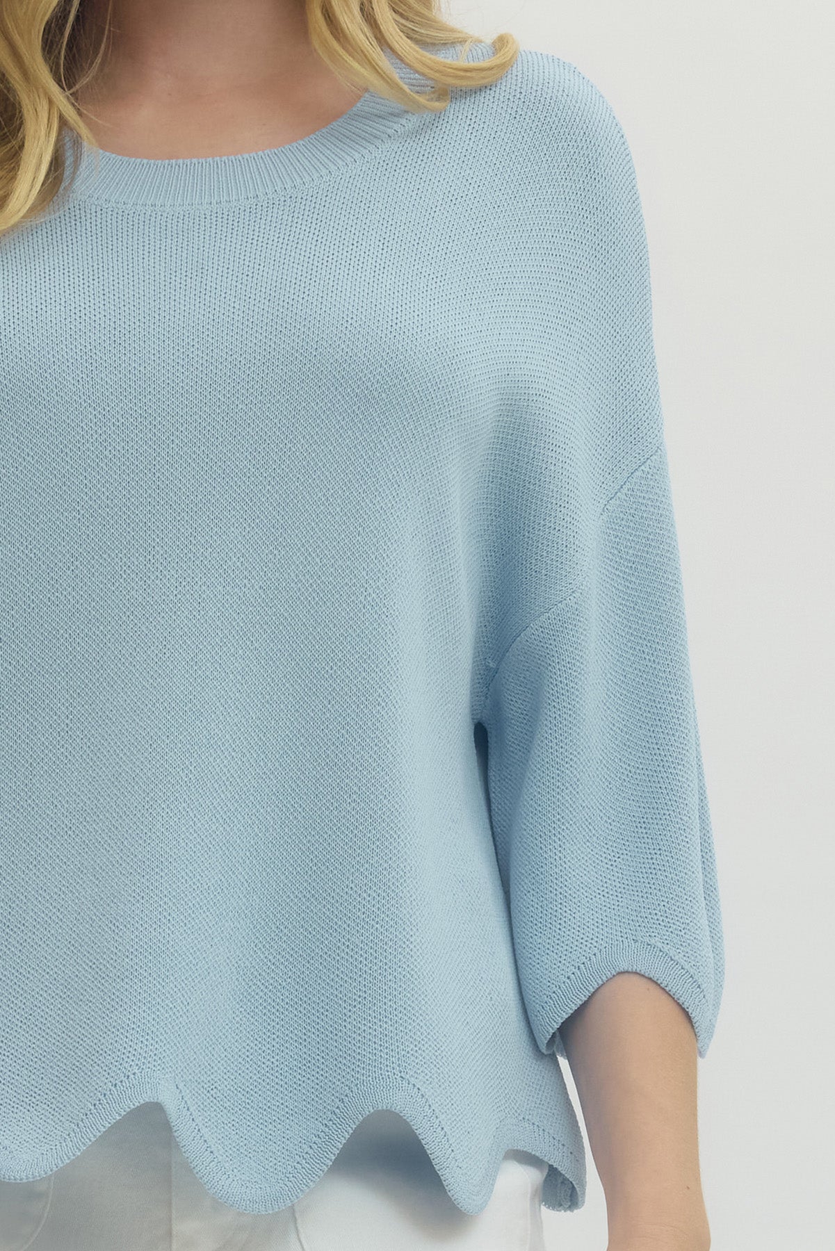 • Solid knit 3/4 dolman sleeve top featuring scallop hem