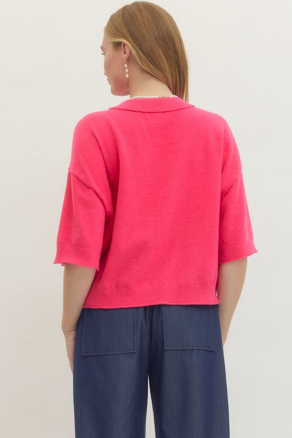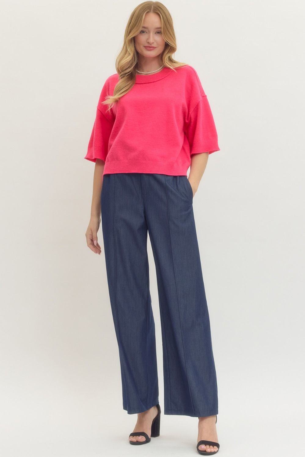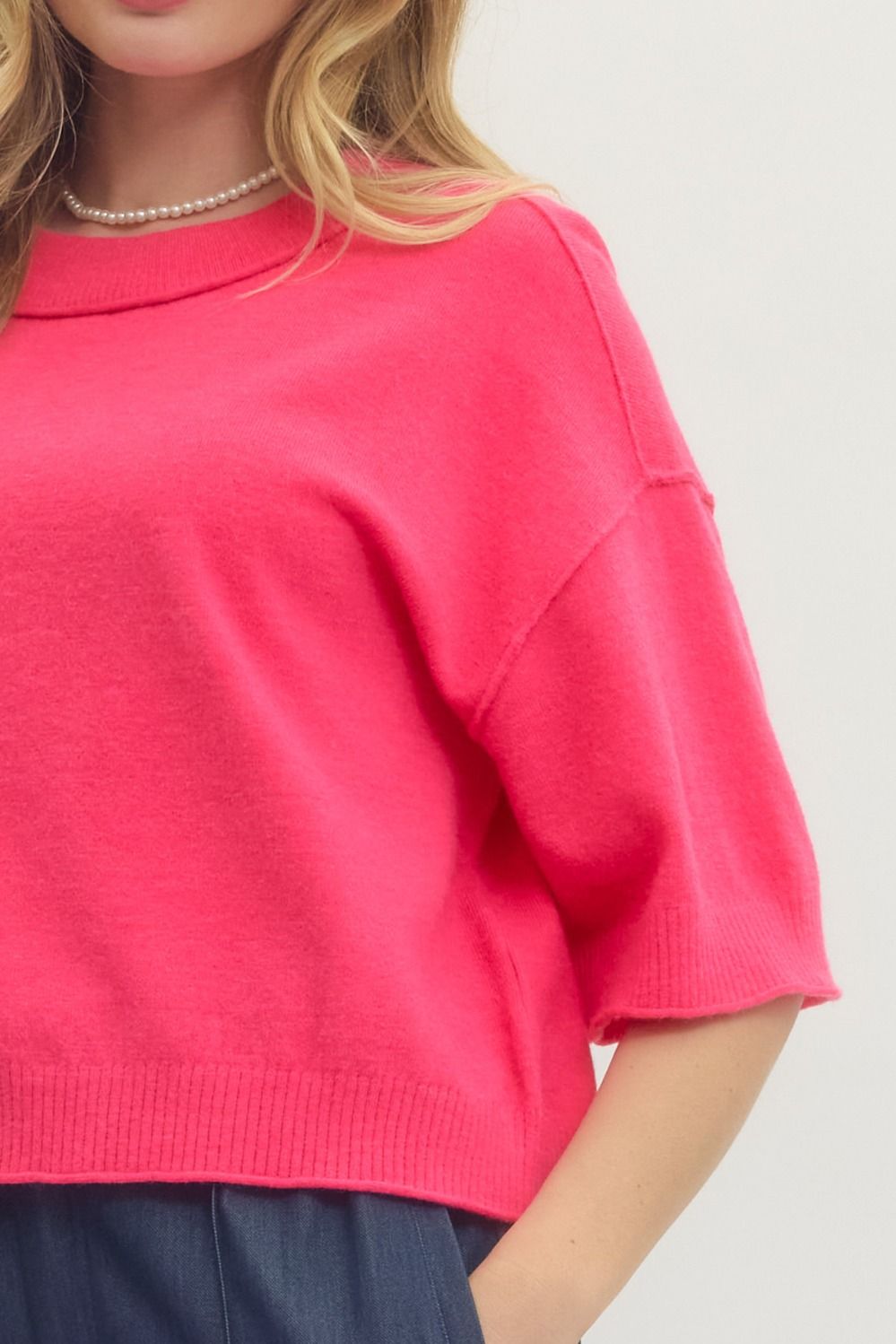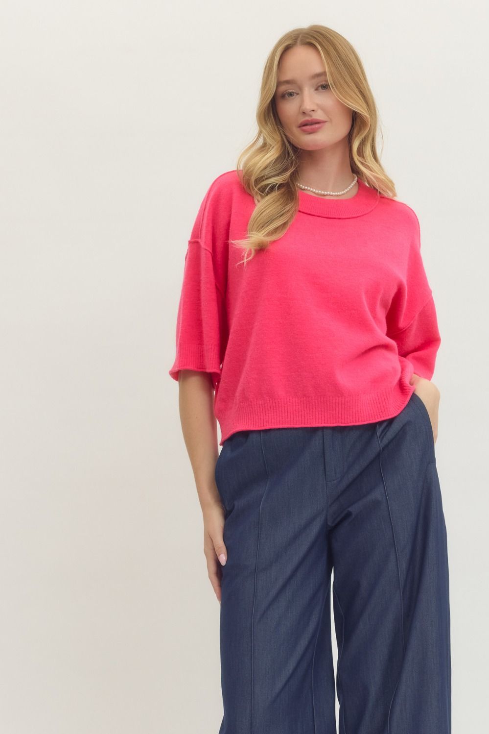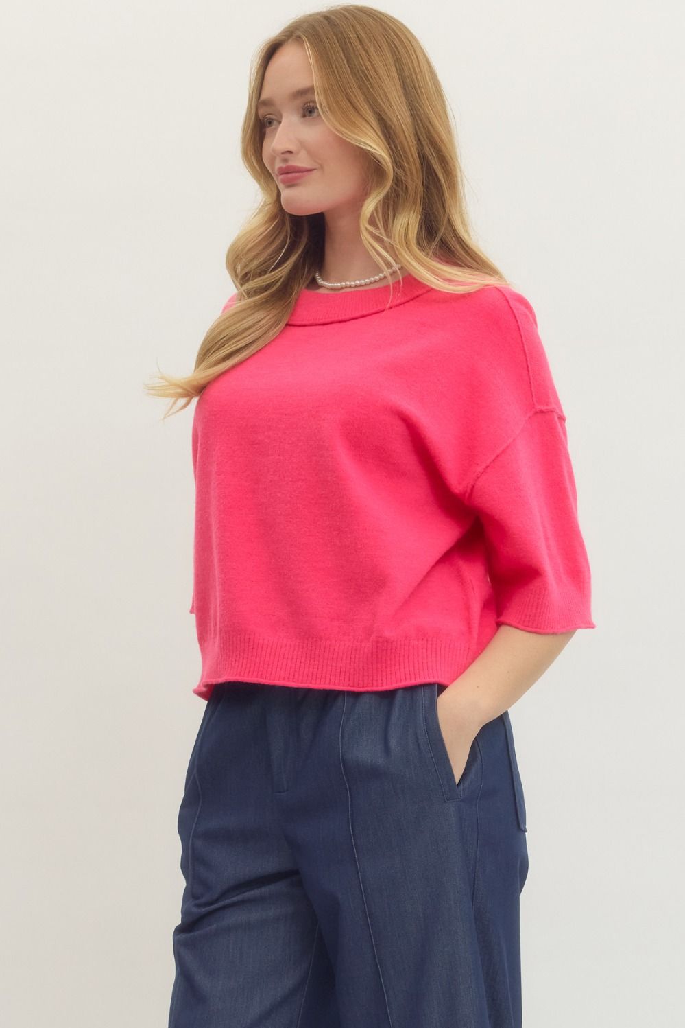 • Solid sweater knit 3/4 wide sleeve pullover