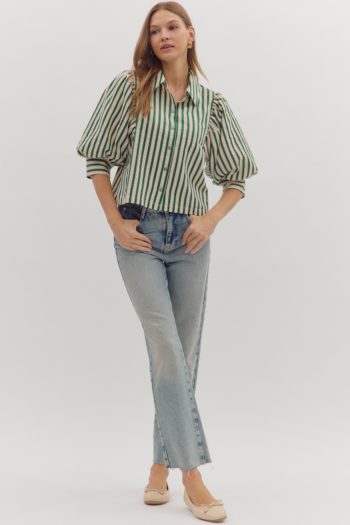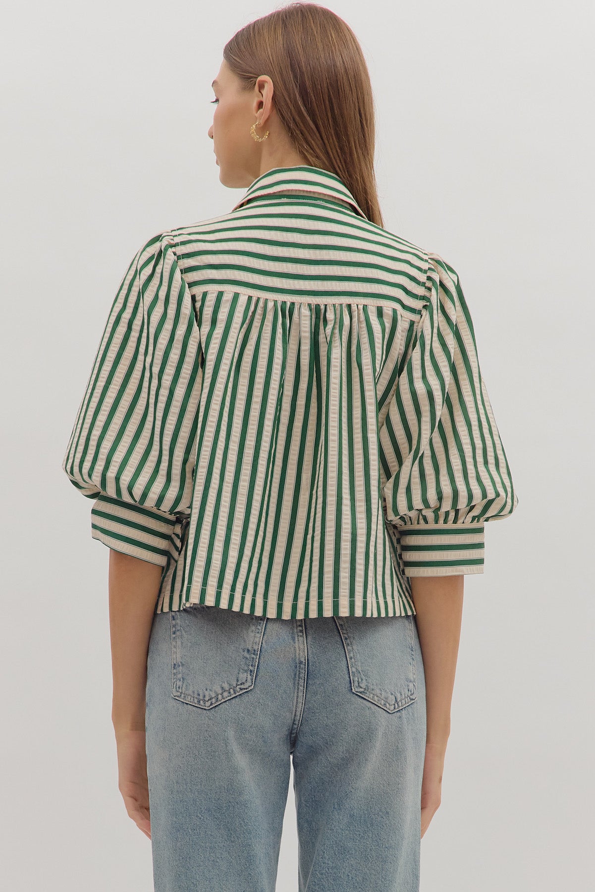 • Striped 3/4 puff sleeve button down top