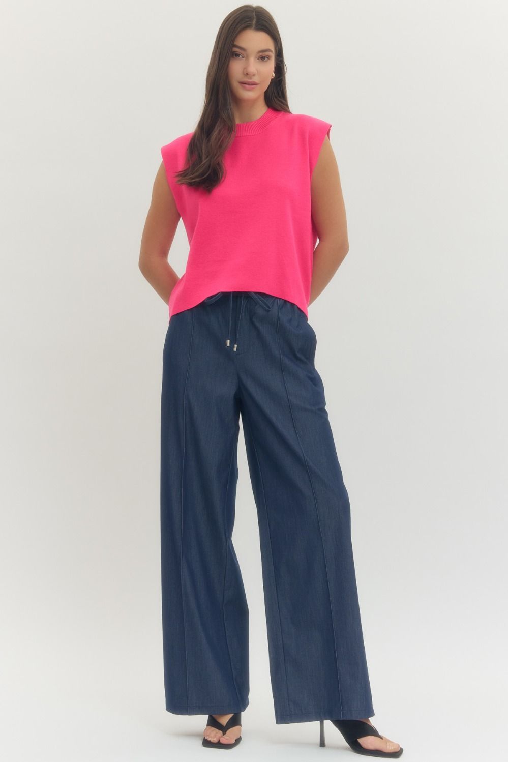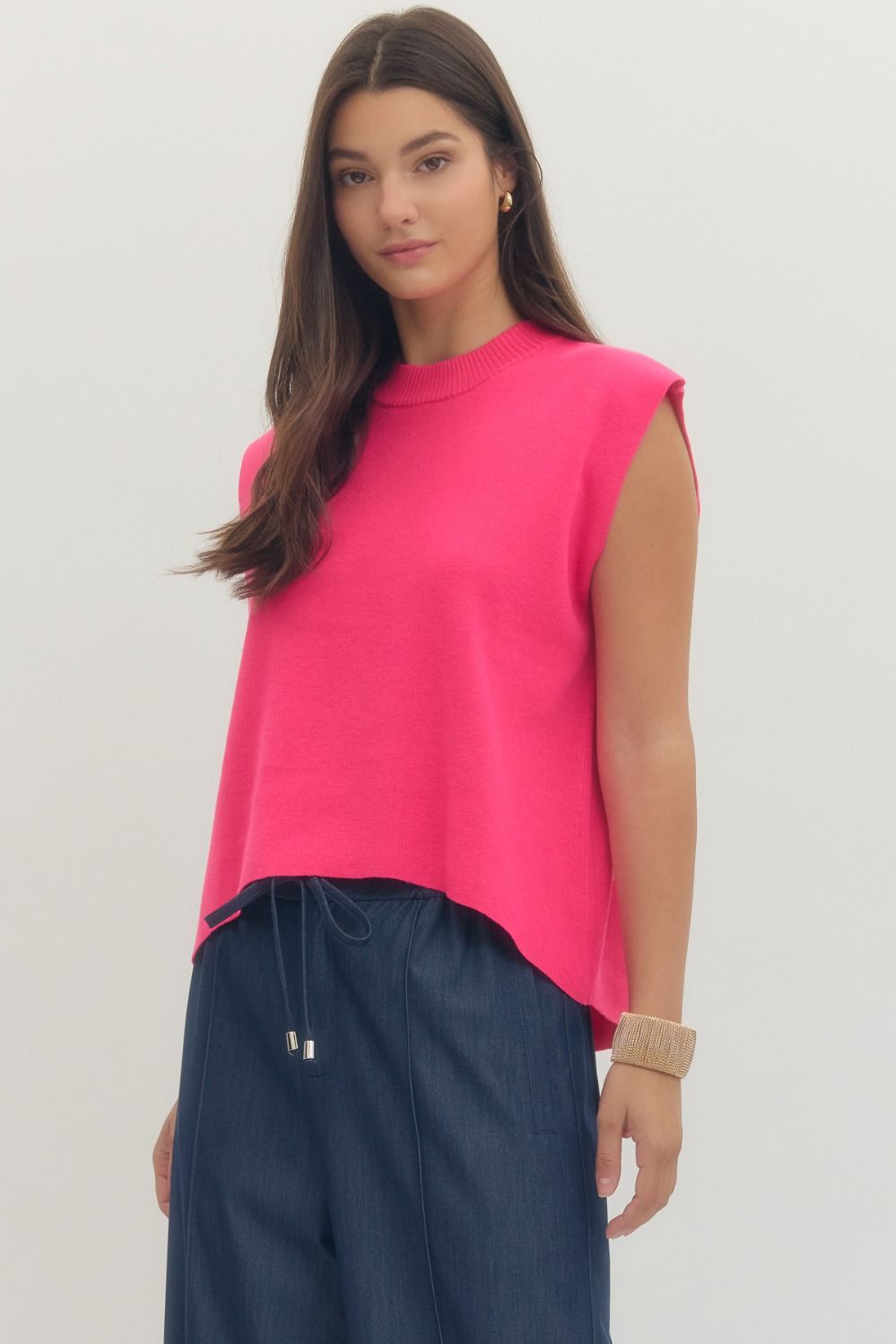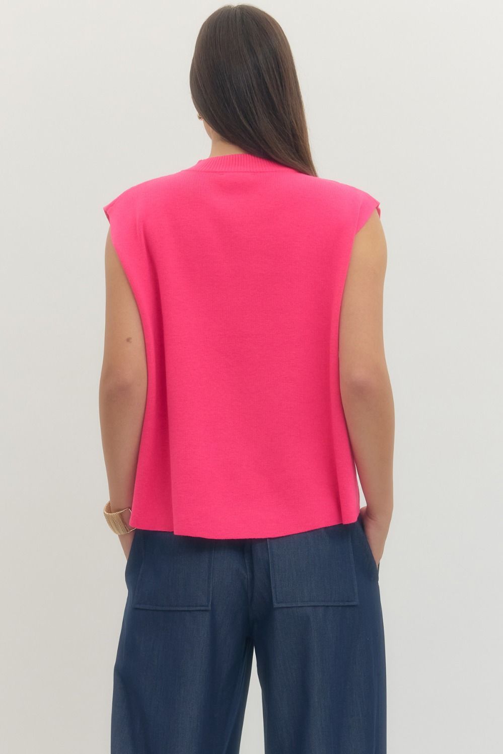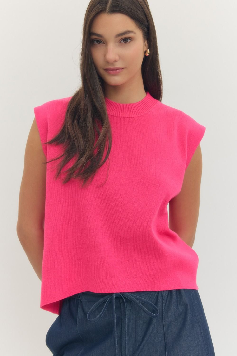 • Solid cap sleeve knit top featuring ribbed mock neck