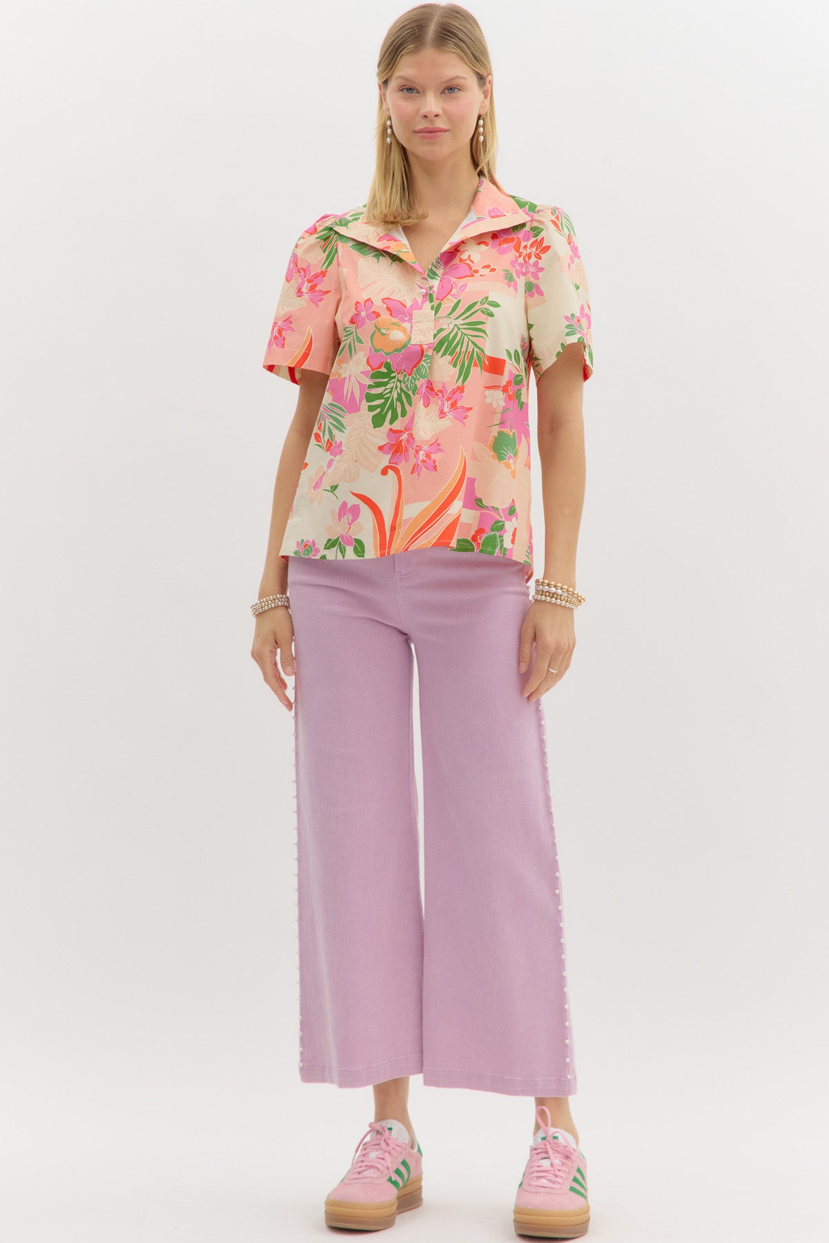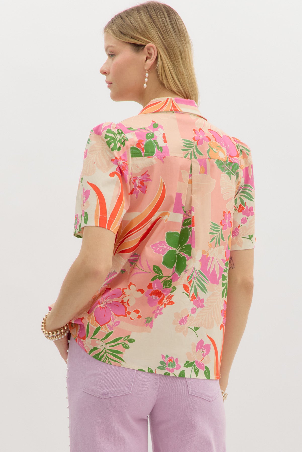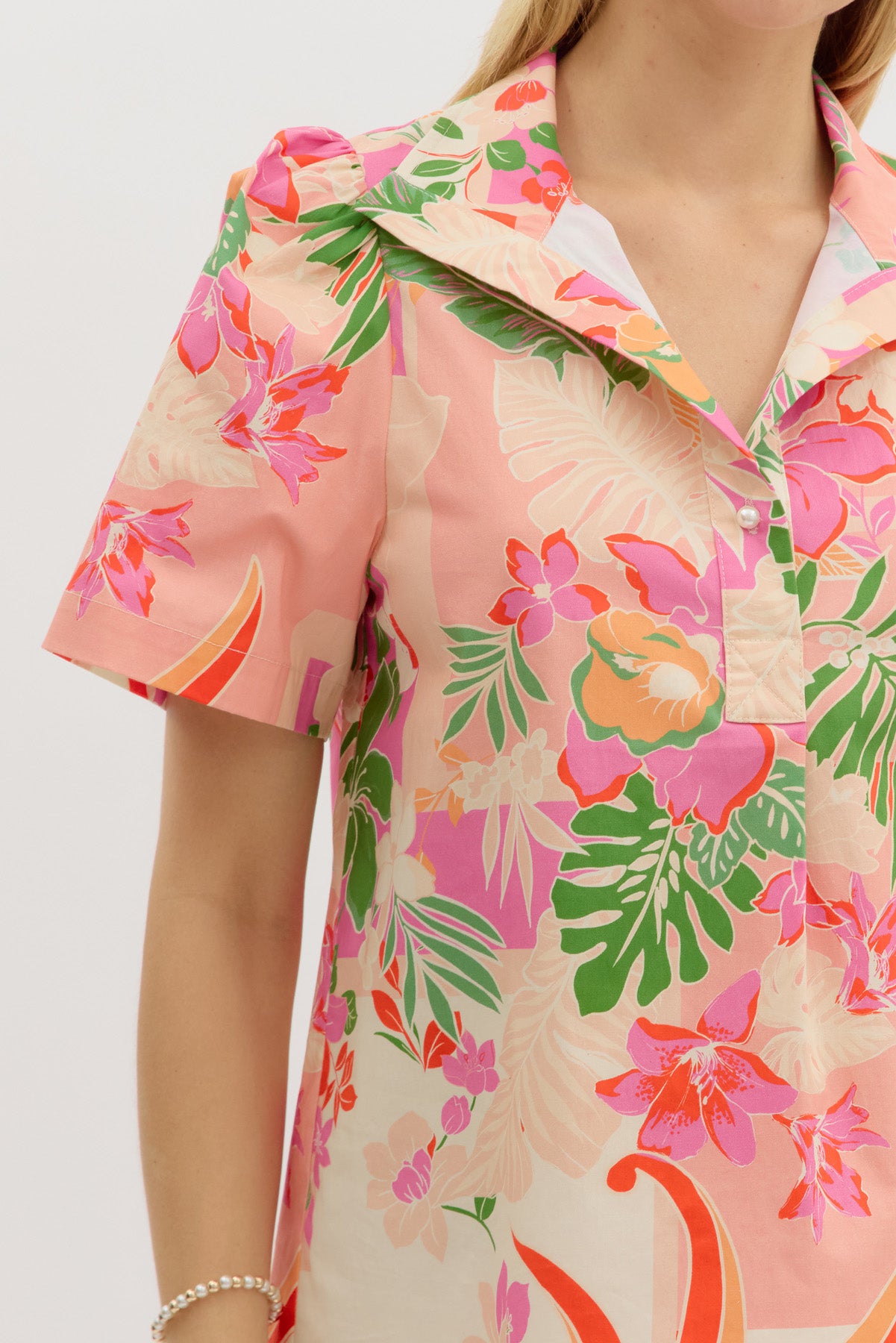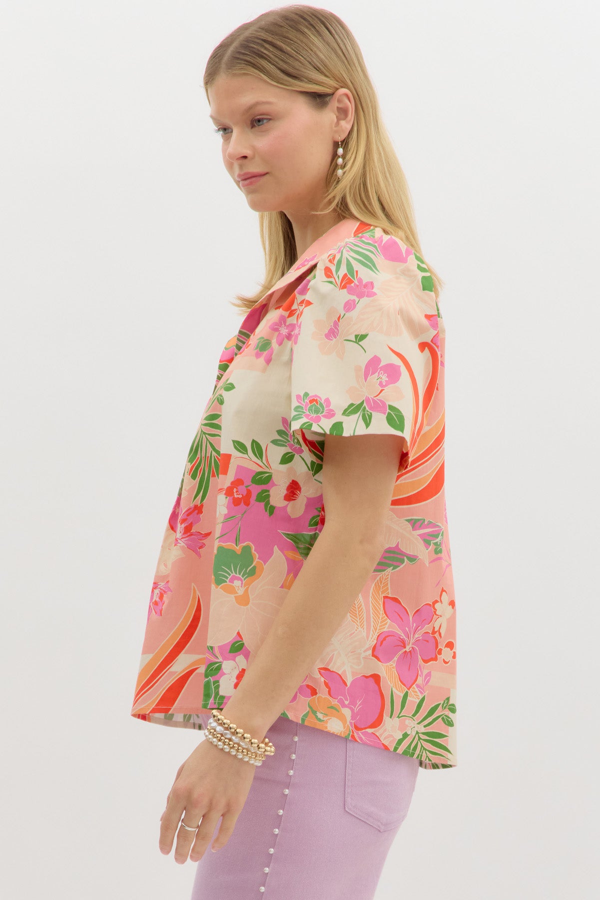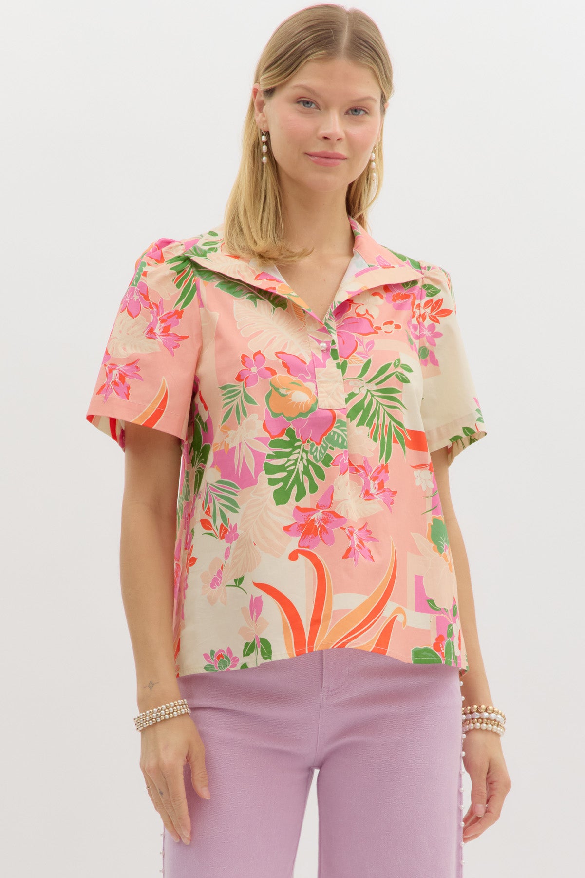 • Tropical print short sleeve top featuring pearl accent spread collar